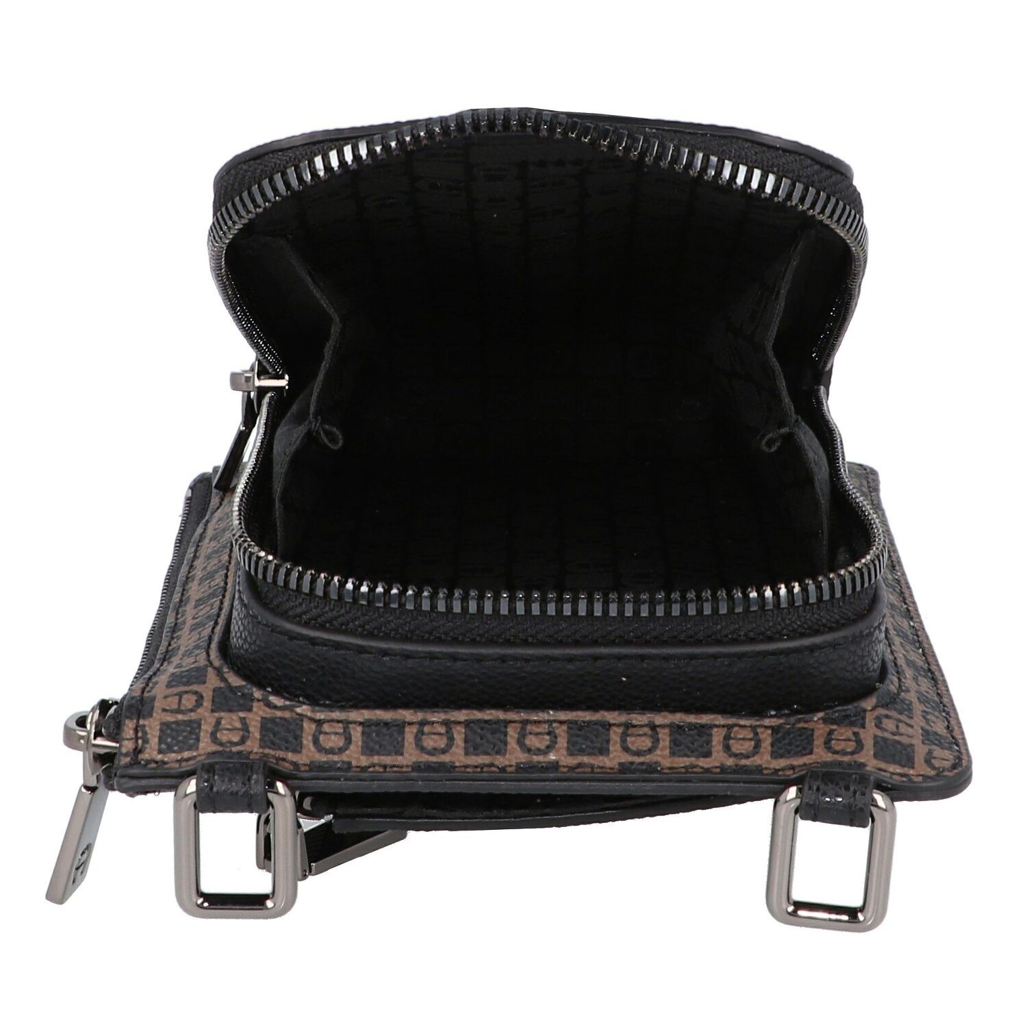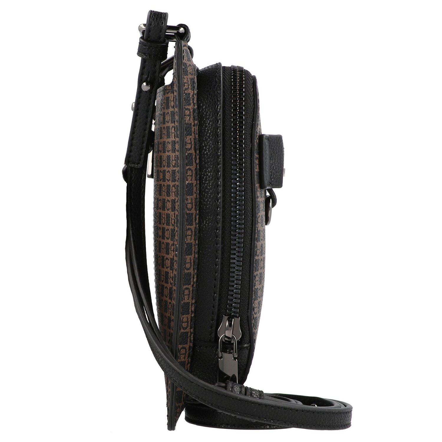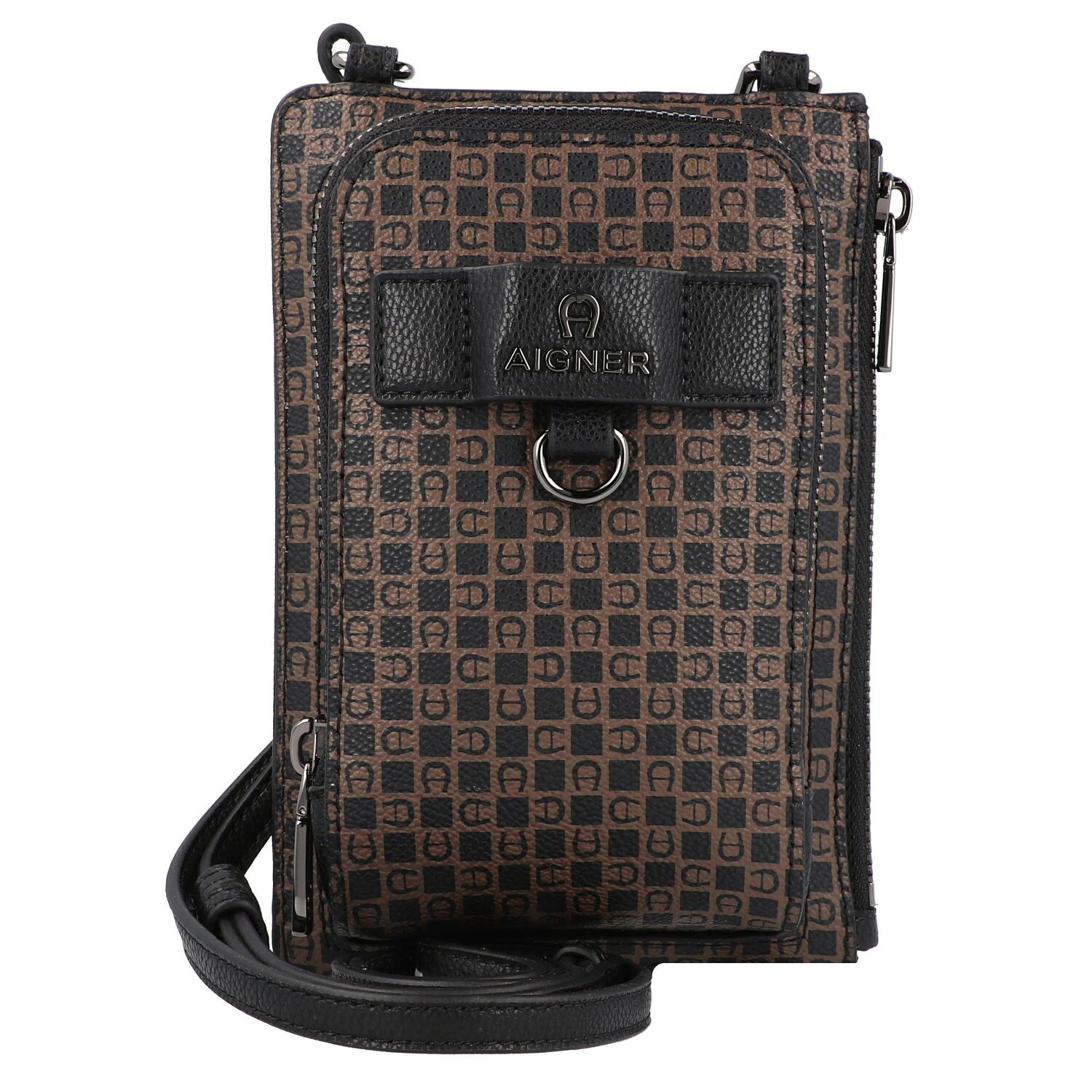 Edle Handytasche der Marke Aigner aus strapazierfähigem Gewebe mit Dadino-Logo-Print. Sie besteht aus zwei Hauptfächern, eins für das Smartphone, das andere für Kleinigkeiten wie etwa Scheine. Die Tasche kann sowohl als mit der Handgelenksschlaufe wie auch als Umhängetasche getragen werden. Die glänzenden Metallakzente runden den Look perfekt ab.