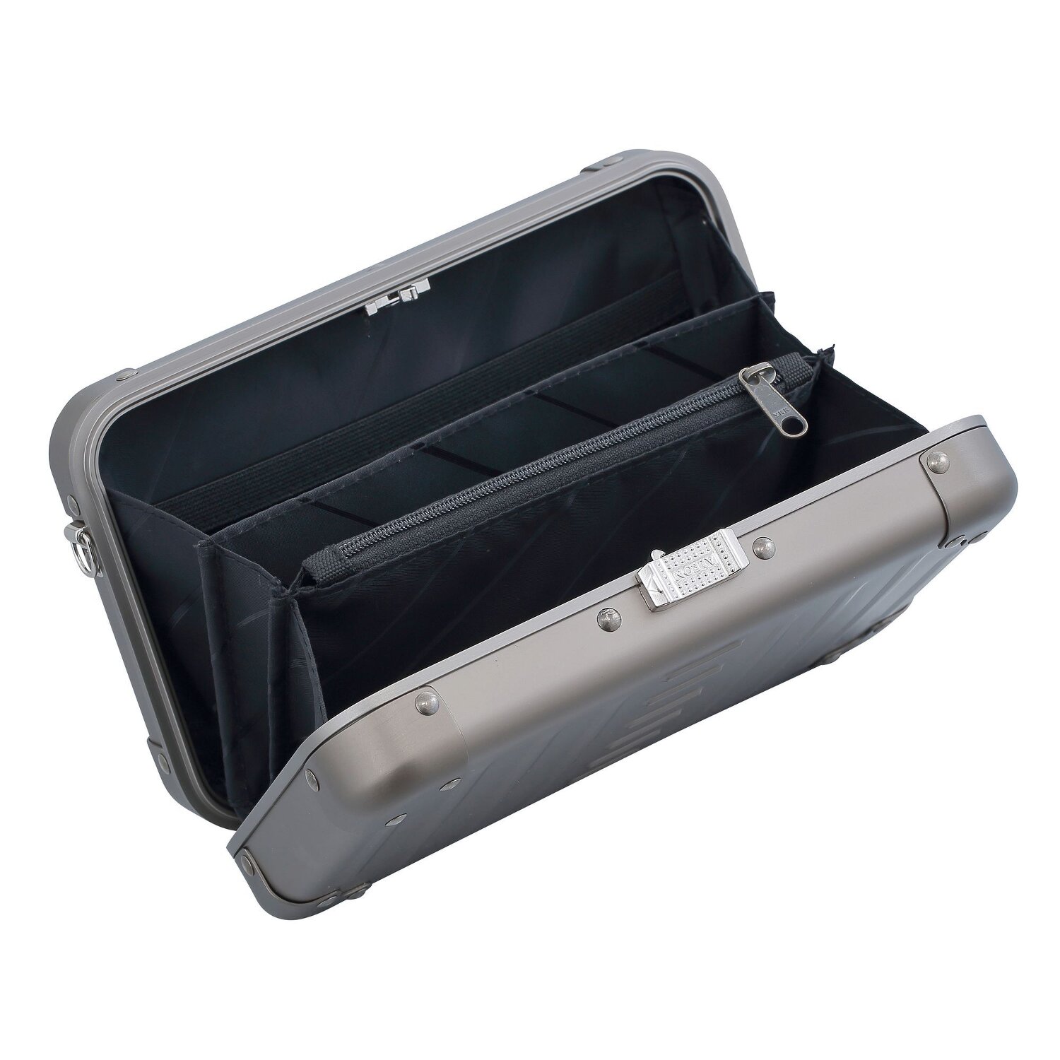 Entdecken Sie die moderne Eleganz der Aleon Umhängetasche aus Aluminium. Das durchdachte Design bietet im Inneren ein Reißverschlussfach und mehrere Steckfächer. Der abnehmbare, längenverstellbare Umhängeriemen sorgt für Komfort und Stil für Damen und Herren gleichermaßen.
