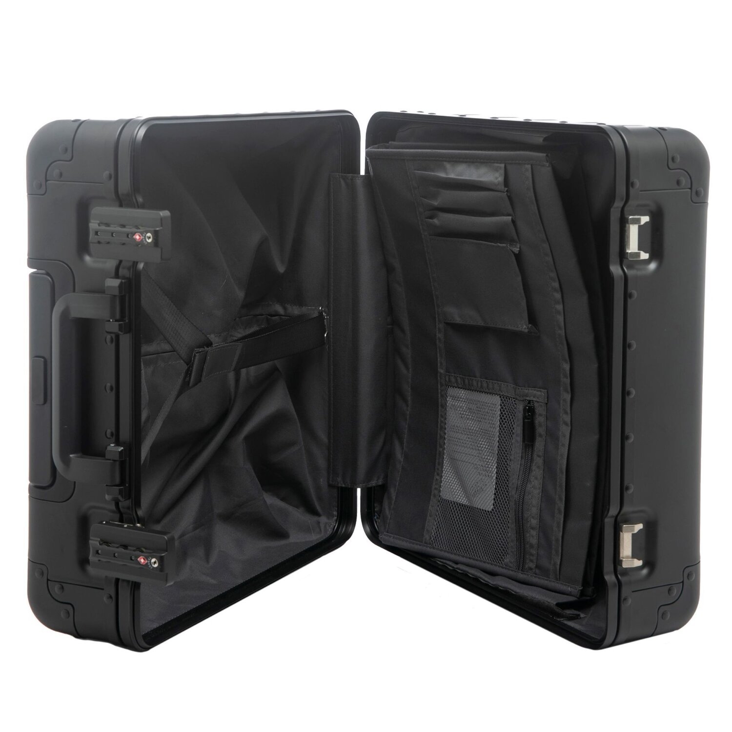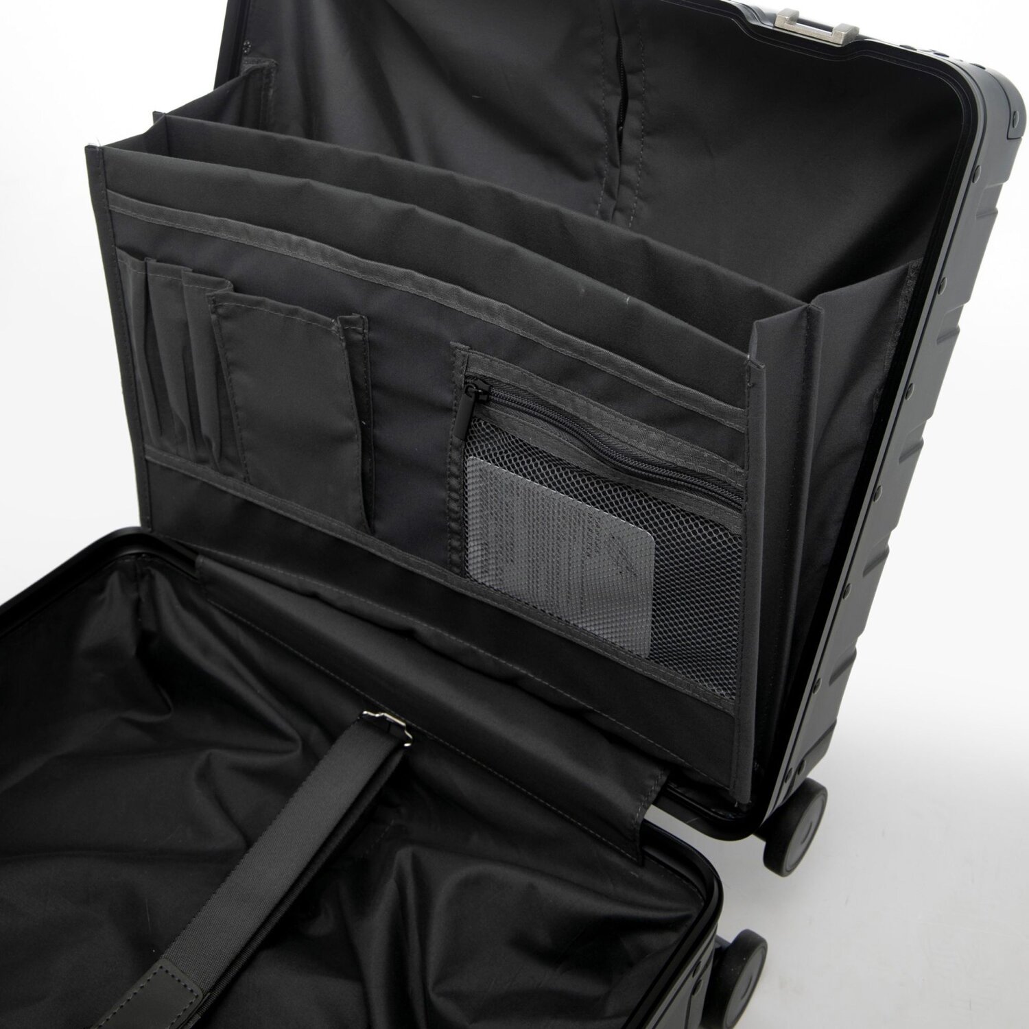 Edler 2-Rollen Pilotentrolley von Alumaxx aus robustem Aluminium mit herausnehmbarem Organizerfach. Das Hauptfach des Koffers bietet viel Platz für Unterlagen sowie alle möglichen Arbeitsutensilien und ist in mehrere Fächer unterteilt. Das Organizerfach ist mit einem Laptopfach, einem Handyfach, drei Stiftelaschen ausgestattet.