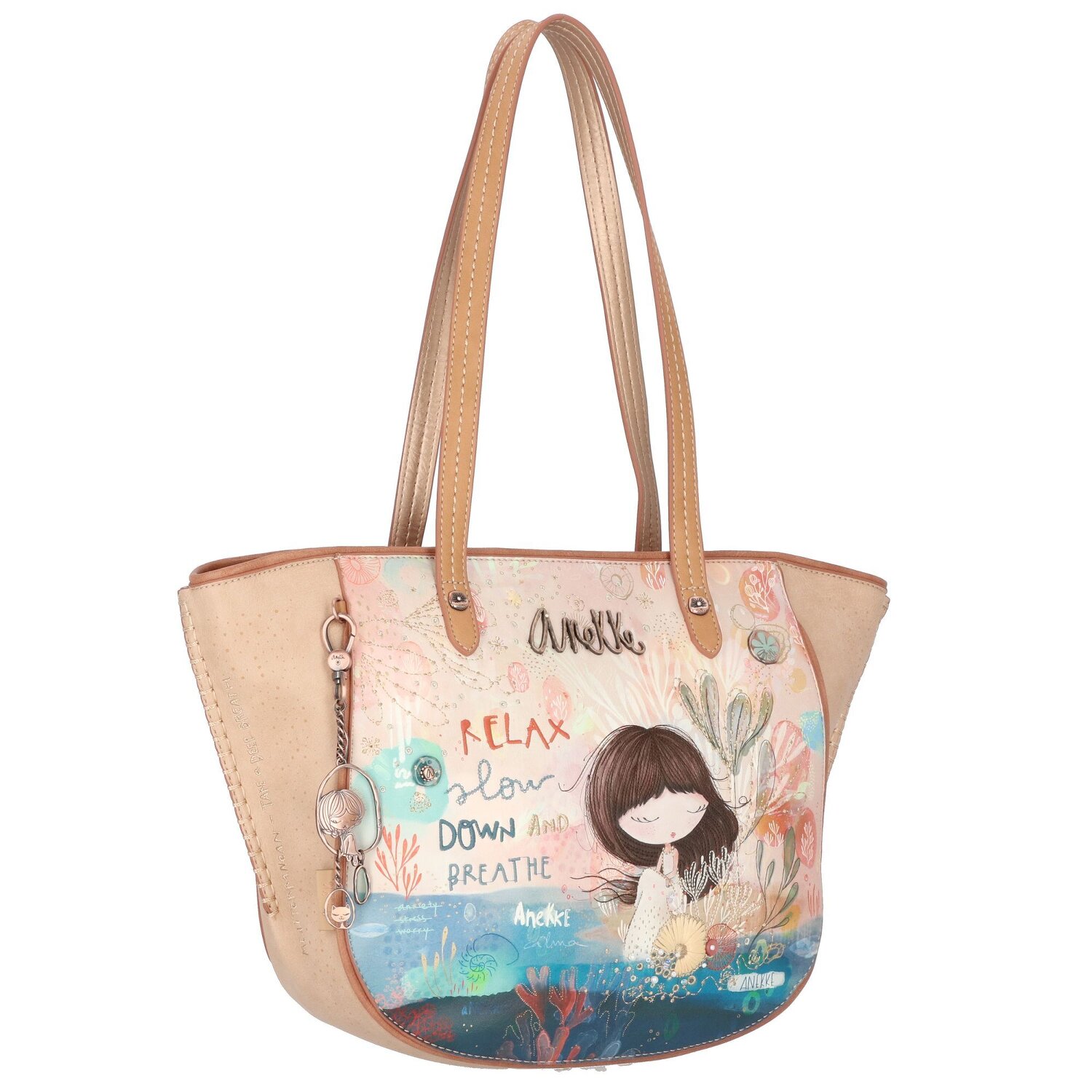 Schöner Shopper von Anekke mit auffälligem Muster. Im Hauptfach befinden sich Steck- und Reißverschlussfächer. Ein Reißverschlussfach auf der Rückseite sorgt für zusätzlichen Stauraum. Die Tasche besticht durch ihre schöne Form und Funktionalität. Ein kleiner abnehmbarer Anhänger rundet den Look ab. Der praktische und gleichzeitig stylische Begleiter.