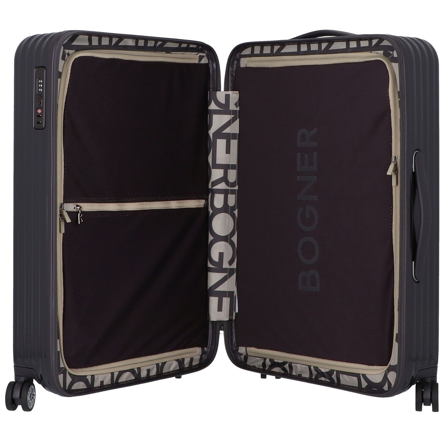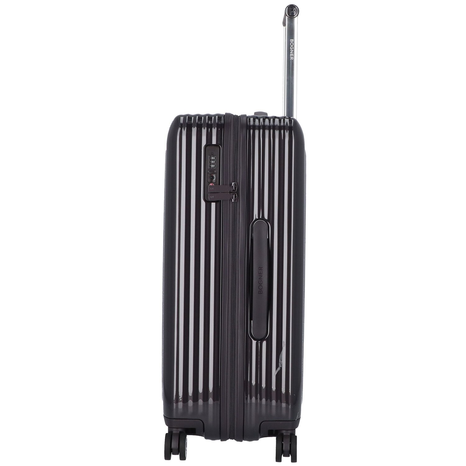 Stylischer 4-Rollen Trolley von Bogner Luggage aus widerstandsfähigem Polycarbonat. Der Trolley verfügt über ein geräumiges Hauptfach mit einem Kreuzpackgurt, sowie ein separat Nebenfach und bietet viel Platz für ihr Gepäck. Vier geräuscharme und in alle Richtungen bewegliche Doppelrollen, arretierbarer Griff und ein integriertes TSA-Schloss für zusätzliche Sicherheit runden den Trolley ab.