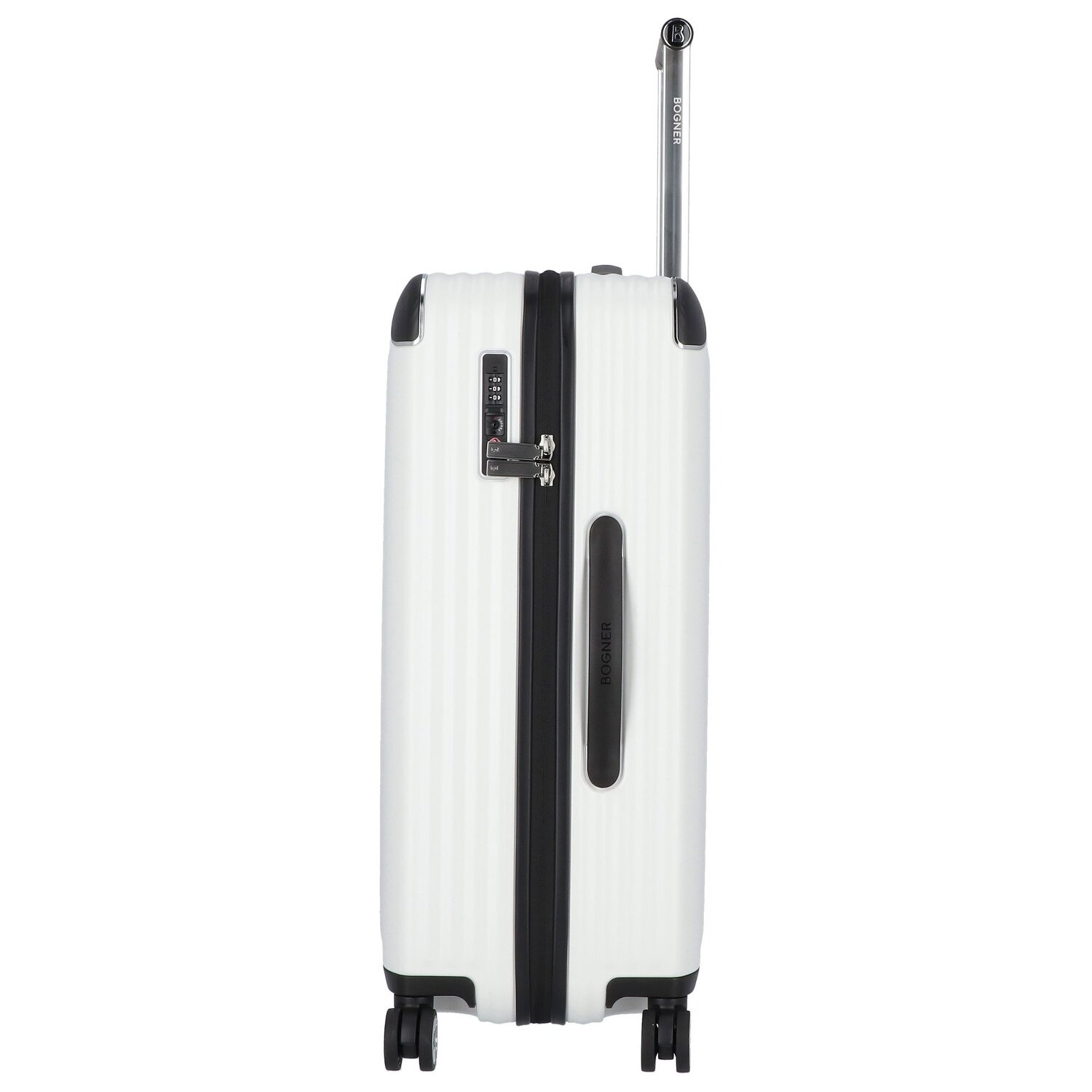 Stylischer Trolley von Bogner Luggage in stilvollem Design. Das Hauptfach ist geräumig und mit zwei Wäschefächern sowie Reißverschlussfach ausgestattet. Tragegriff und arretierbarer Griff sowie 4 Rollen sorgen für die notwendige Mobilität.
