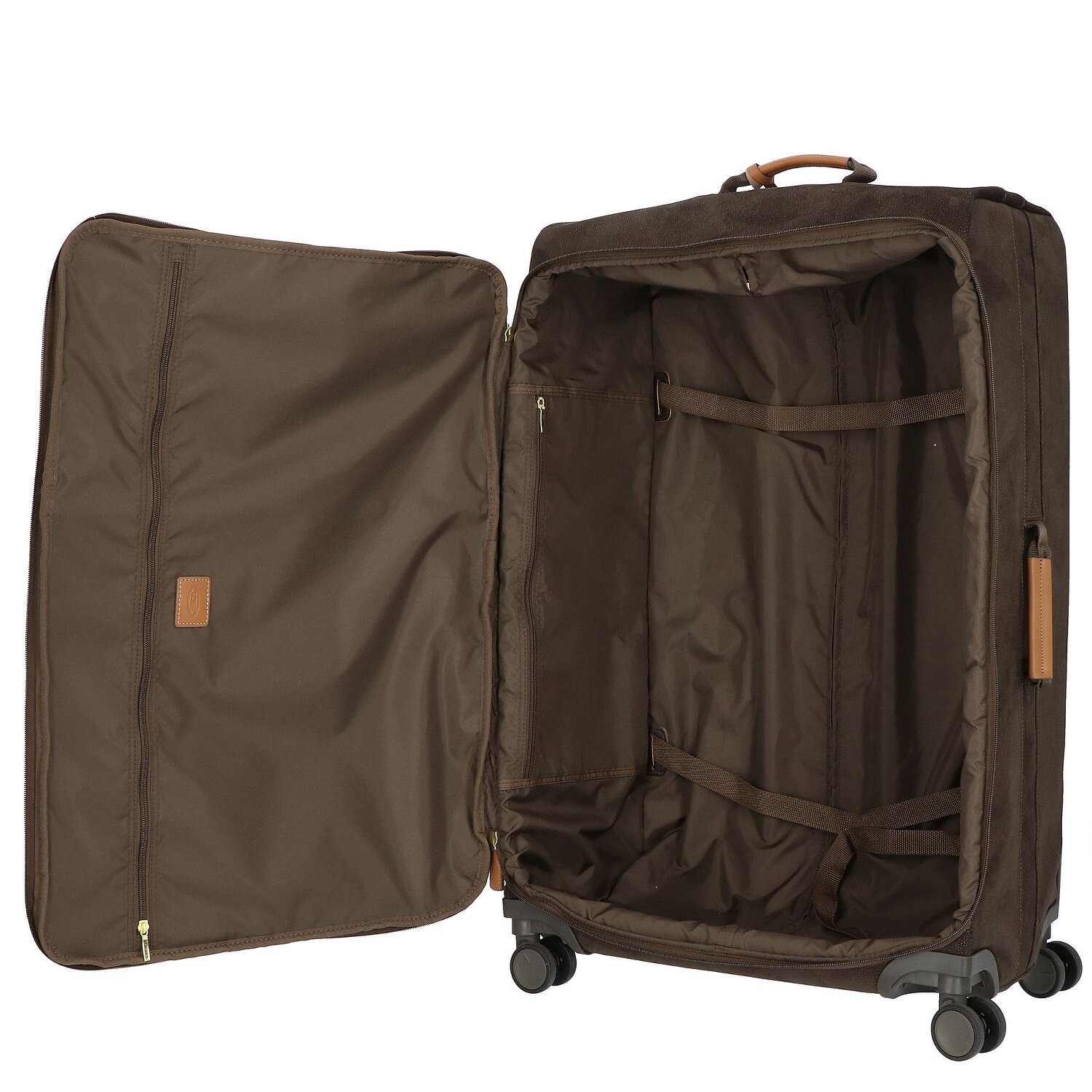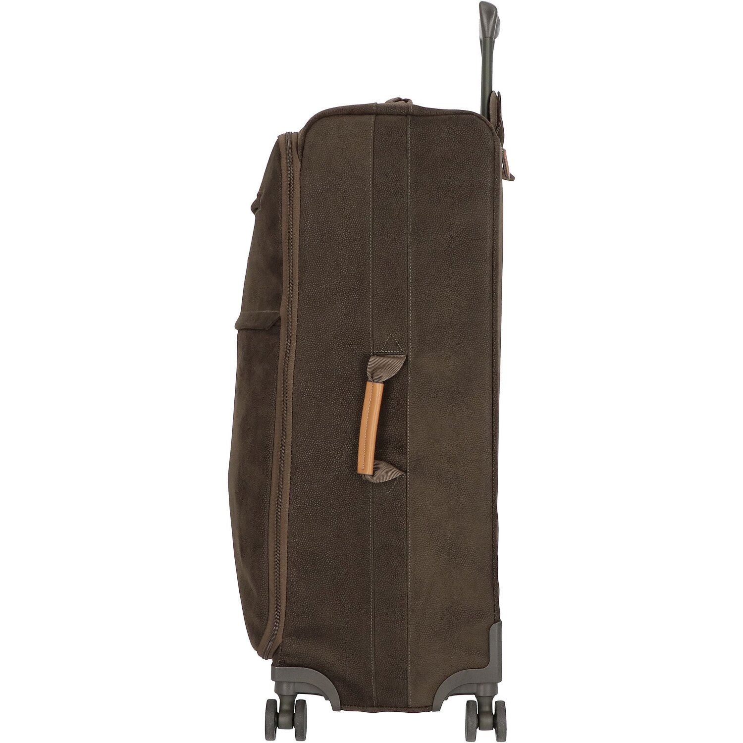 Designstarker Trolley der Marke Bric's aus robustem Material in Wildlederoptik mit Details aus Leder, 4 Rollen und arretierbarem Teleskopgriff. Der Trolley überzeugt durch seine hohe Verarbeitungsqualität und verfügt über ein geräumiges Hauptfach mit Packriemen und ein Reißverschlussfach sowie über zwei weitere Fächer auf der Vorderseite für Ordnung und Übersicht. Der ideale Begleiter auf Reisen.