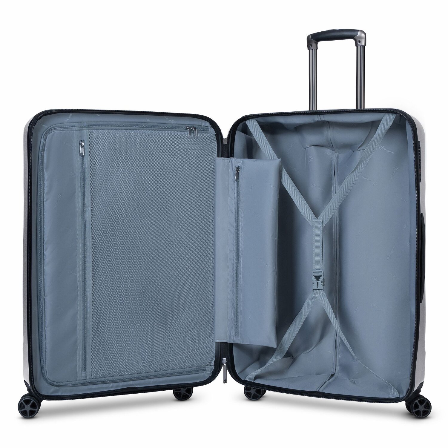 Eleganz trifft auf Funktionalität: Hochwertiger Trolley von Bugatti aus strapazierfähigem ABS in modernem, formschönem Design. Der Trolley mit vier stabilen Rollen, Teleskopgriff und TSA-Zahlenschloss bietet ein geräumiges Hauptfach mit Kreuzspanngurt und Reißverschlussfach sowie ein großes Netzfach.