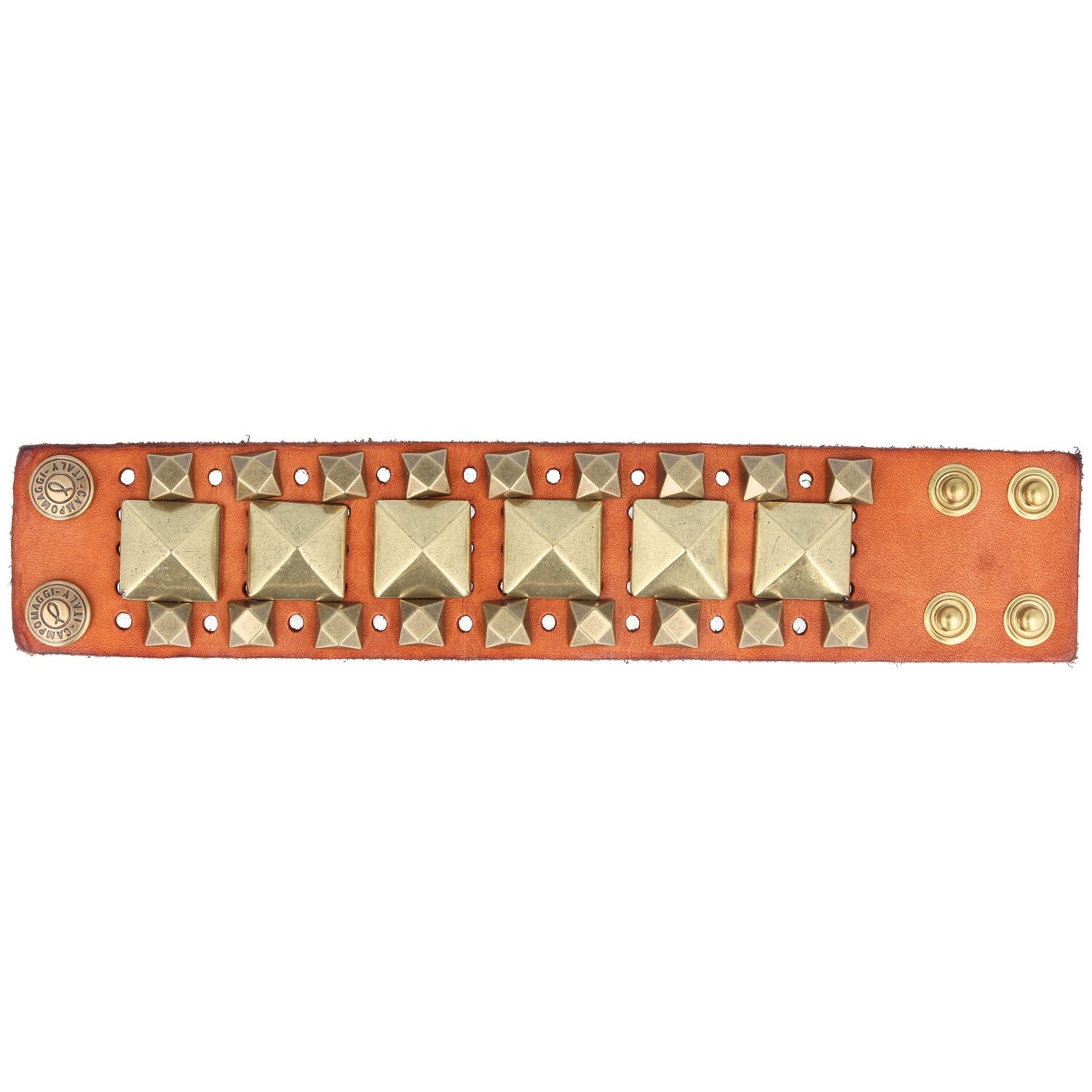 Trendiges Armband der Marke Campomaggi aus hochwertigem Leder mit kunstvoll verarbeiteten Metallnieten. Das ideale Accessoire für den perfekten Look. Das Armband wird sicher mit zwei Druckknöpfen geschlossen und ist verstellbar.