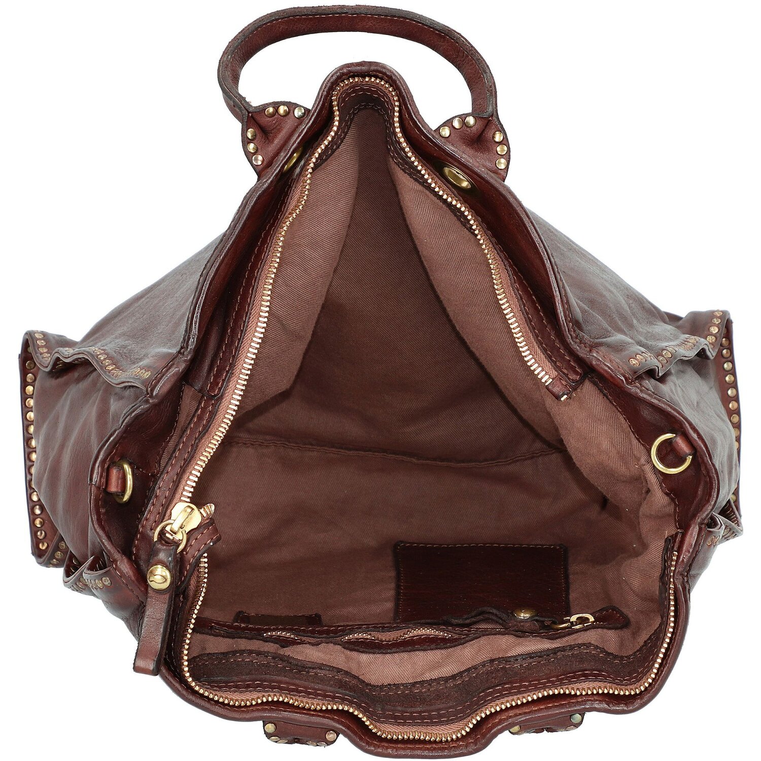 Klassisch, luxuriöse Schultertasche von Campomaggi mit auffälligen Nieten- und Metallelementen. Wahlweise können Sie diese Tasche auch mit Umhängeriemen tragen. Je länger man die Tasche trägt, desto individueller wird sie, da das Leder mit der Zeit zusätzlich an Charakter gewinnt.