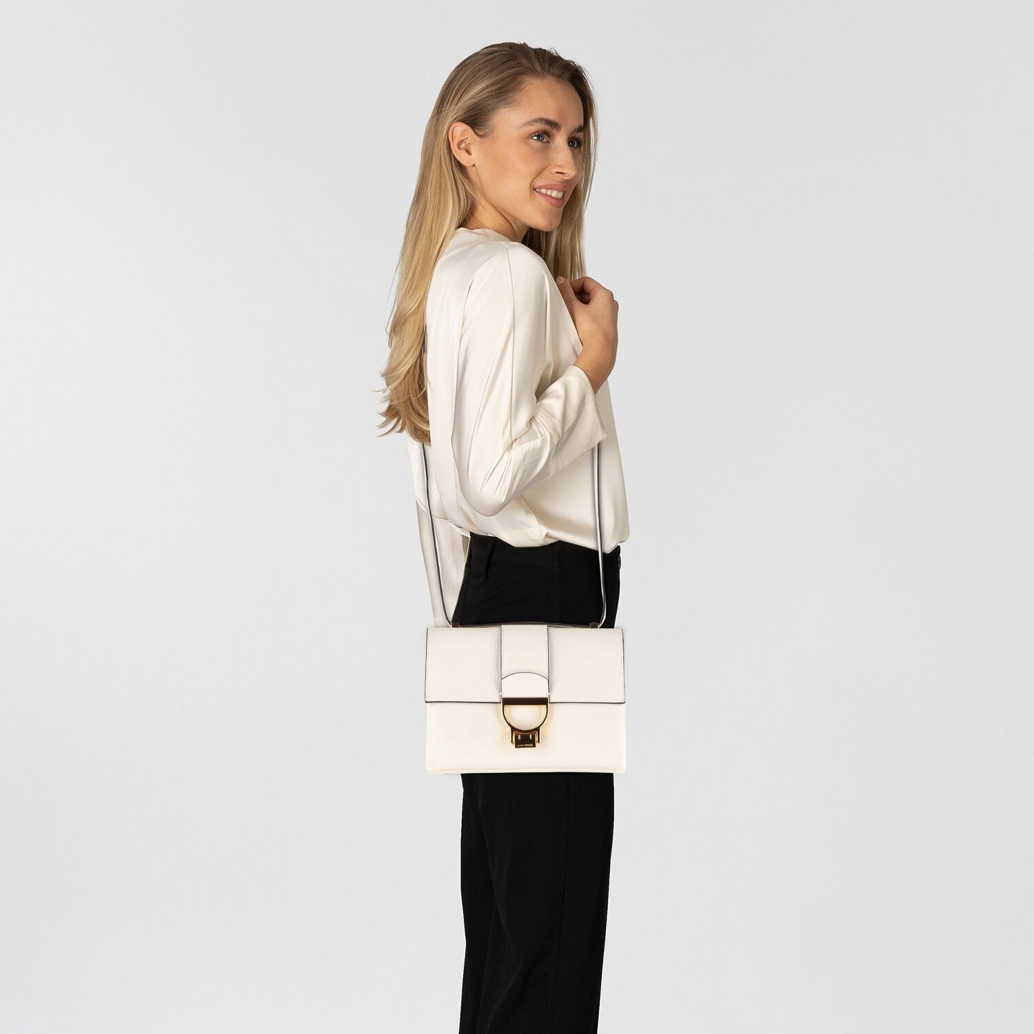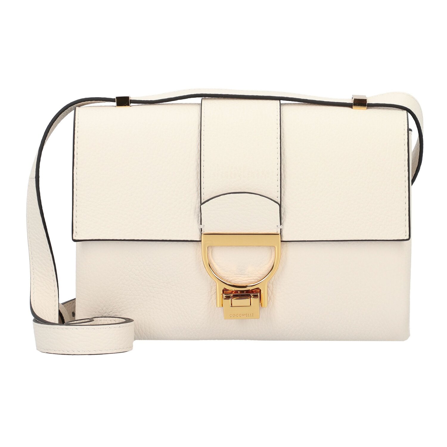 Elegante Umhängetasche von Coccinelle überzeugt durch sanftes Leder und edle Metall-Akzente. Das Hauptfach bietet genug Platz, um alles zu verwahren, was man im Alltag benötigt.