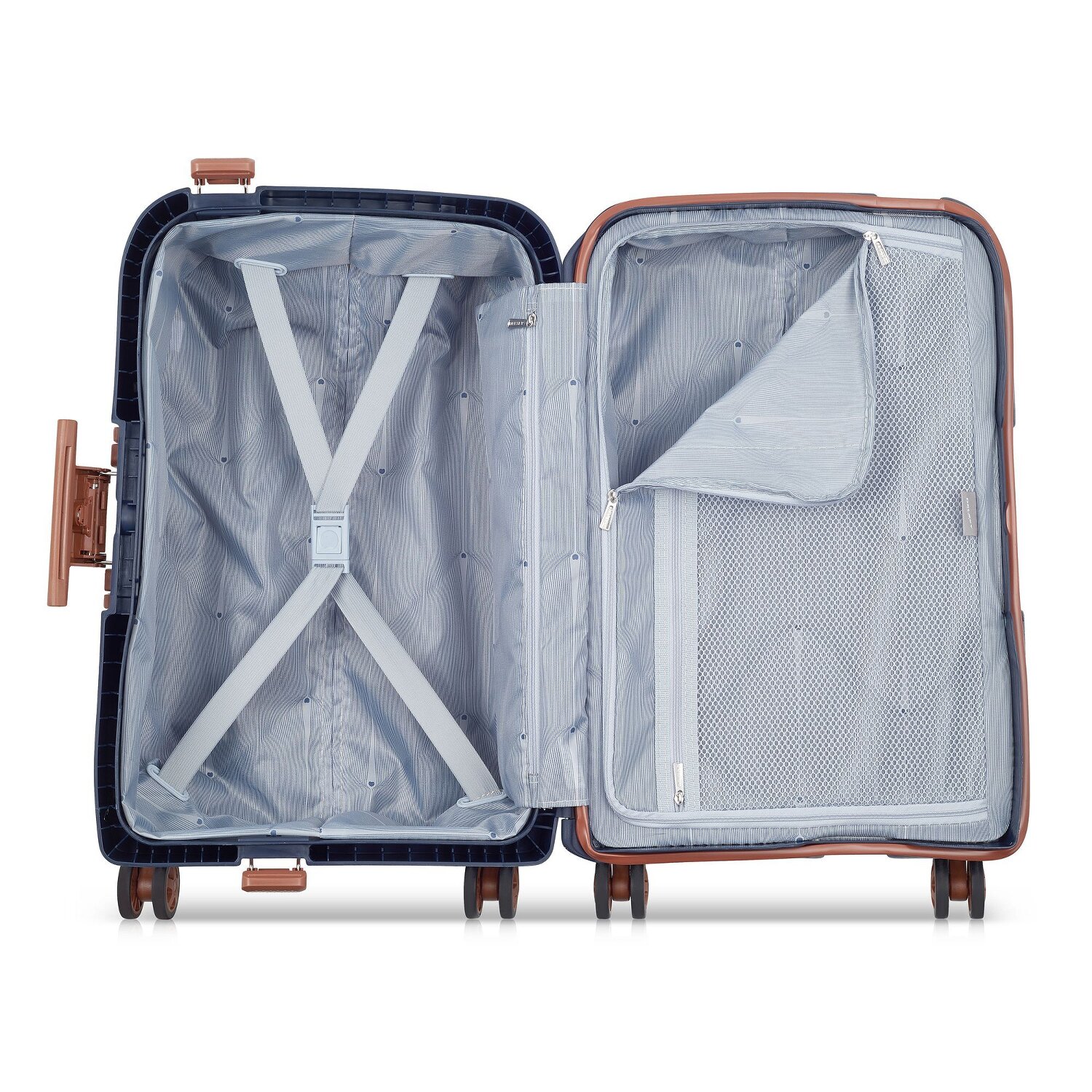 Der Hartschalen-Trolley der Marke Delsey besticht nicht nur durch sein formschönes Design, sondern ist zudem aus äußerst robustem Polypropylen gefertigt. Im Innern befinden sich neben dem geräumigen Hauptfach mit Spanngurten und einem großen Hemdenfach noch drei weitere Reißverschlussfächer, darunter ein Nassfach, für Ordnung und optimale Übersicht.