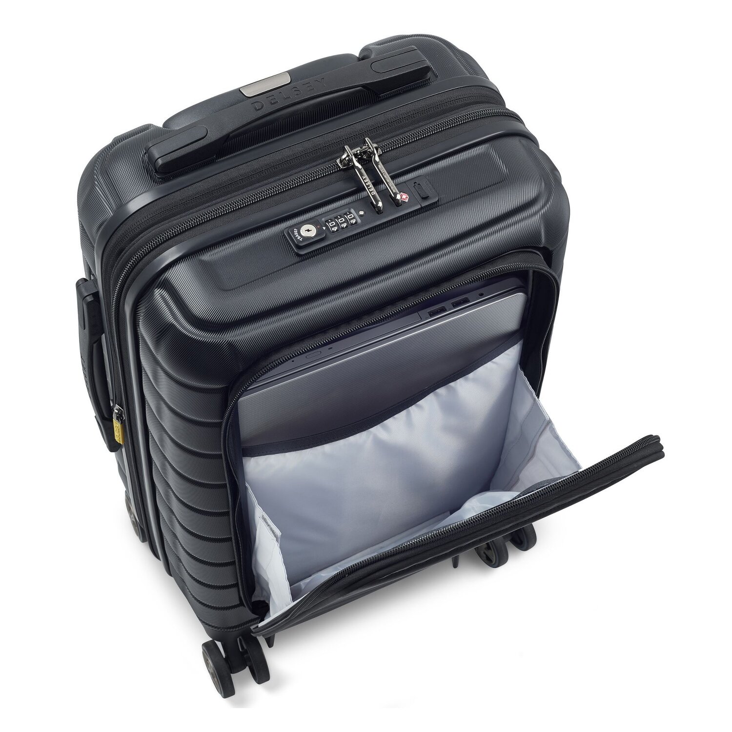 Robuster Kabinentrolley von Delsey aus widerstandsfähigem Polycarbonat. Das geräumige Hauptfach bietet viel Platz und ist dank des Wäschefachs und des Kreuzpackgurts gut organisiert. Zudem verfügt er über eine Erweiterungsfunktion, damit bei Bedarf das Packvolumen vergrößert werden kann. Als Highlight hat der Koffer ein Laptopfach und ist mit einem USB Anschluss ausgestattet für den eine extra Tasche im inneren befestigt ist in der eine Powerbank platz findet, damit sie unterwegs nie auf ihre Elektronik verzichten müssen. Mit den 4 Leichtlaufrollen ist der Koffer besonders flexibel und lässt sich bequem in alle Richtungen schieben und ist durch die gerillte Oberfläche besonders robust und solide.
