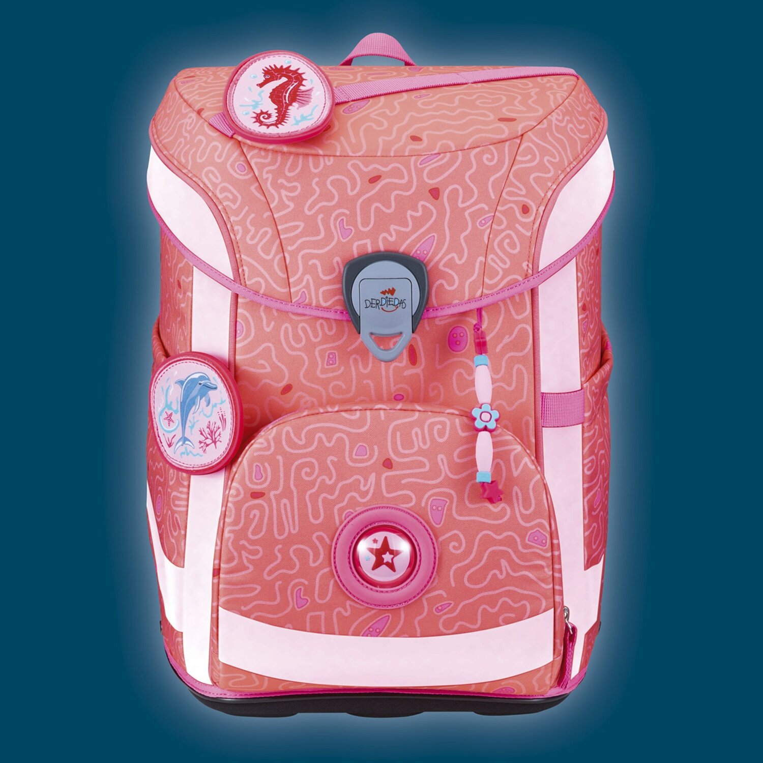 Modischer Schulranzen mit retroreflektierendem Material an Deckelklappe, Front, Tragegurt und Seitenflächen. Der Schulranzen hat eine tolle Optik und ist super leicht. Durch das 5tlg. Set ist das Kind perfekt für den Schulalltag ausgestattet. Das Set besteht aus: Schulranzen, Sportbeutel, gefülltem Schüleretui, Hefte Box, Schlampermäppchen und austauschbare Buttons.