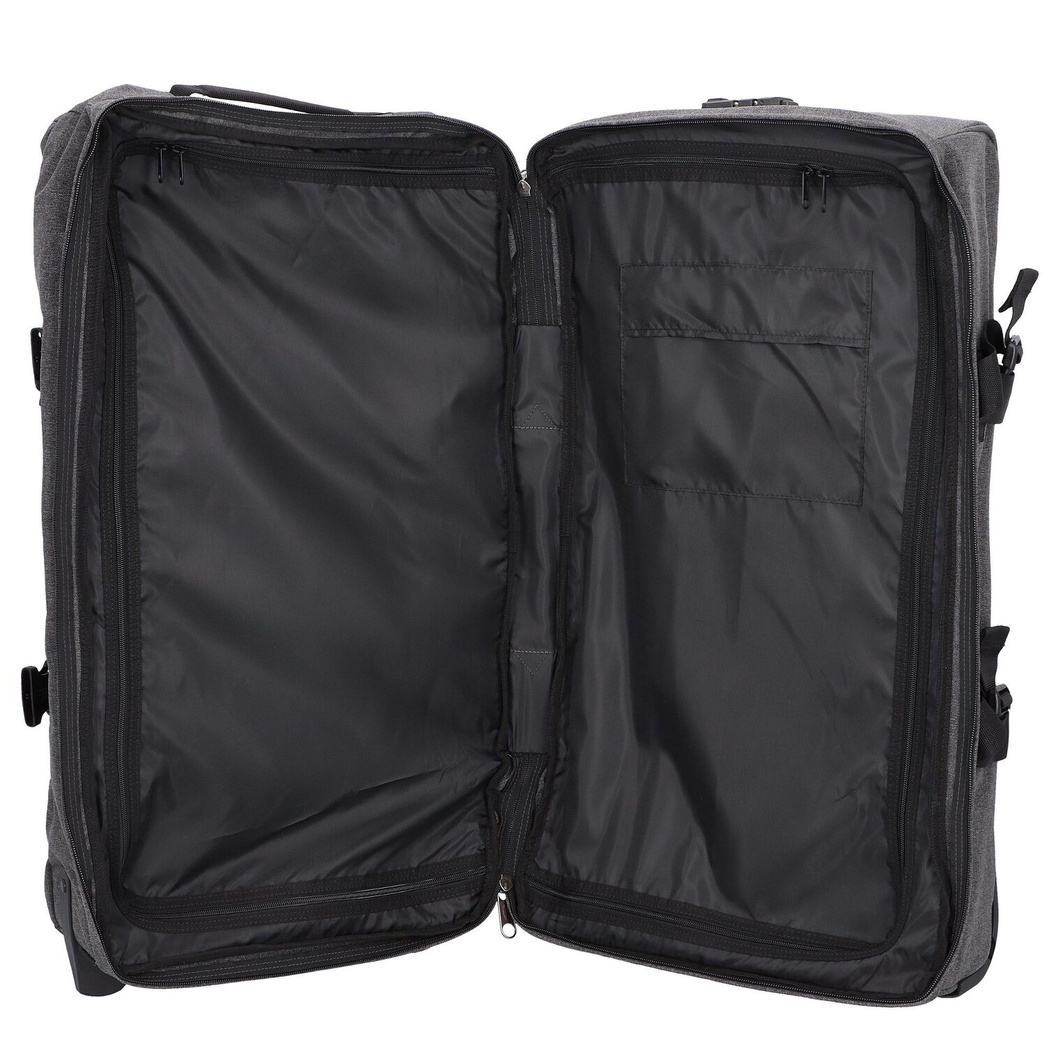Robuste Reisetasche in bewährter Eastpak-Qualität aus strapazierfähigem Polyester mit 2 stabilen Rollen und Teleskopgriff. Der geräumige Trolley mit TSA-Zahlenschloss bietet zwei große Hauptfächer, davon eines mit Kreuzpackgurt, und zwei Nebenfächer.