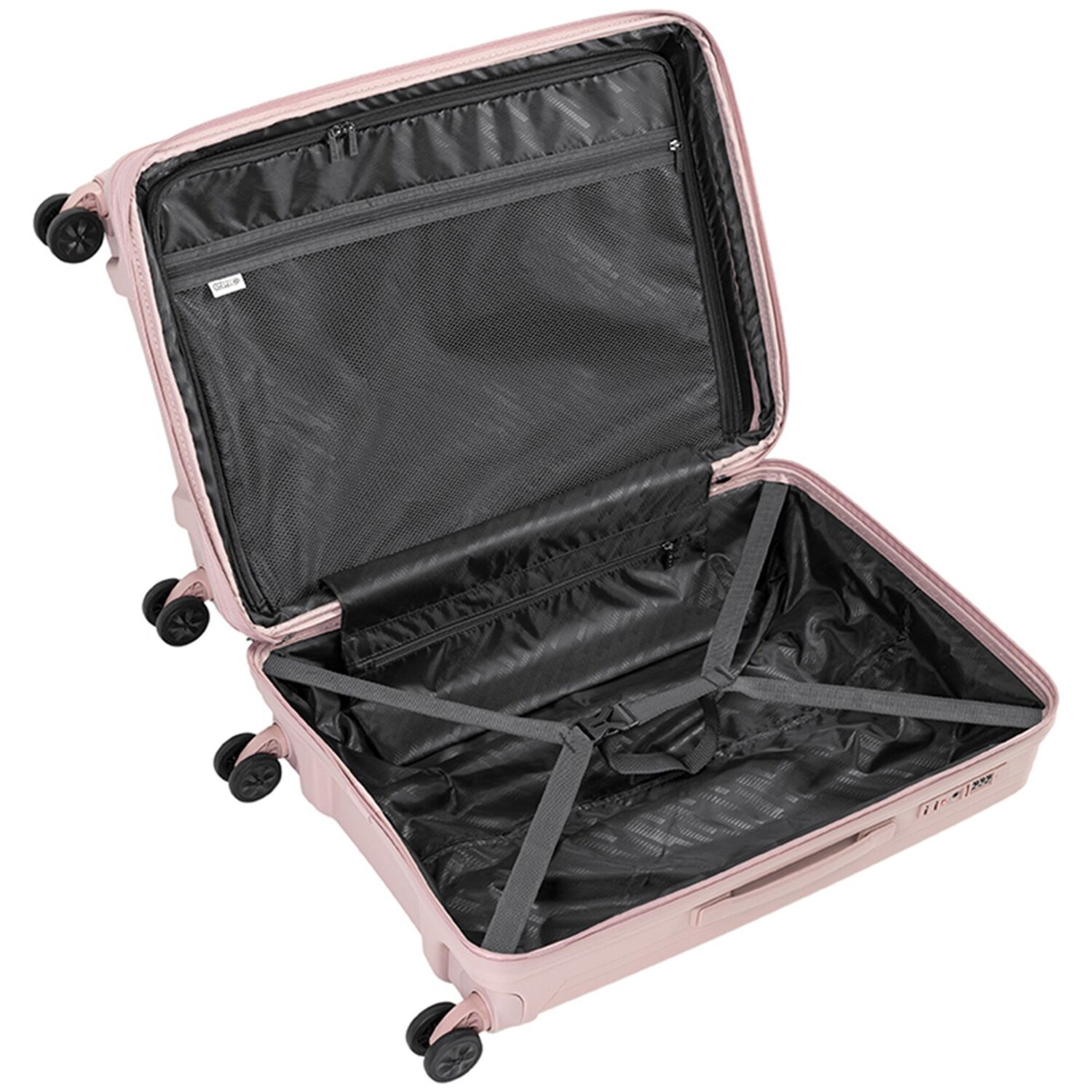 - Ausstattung: Wäschefach, Reißverschlussfach, Kreuzpackgurt, Dehnfalte, arretierbarer Griff
