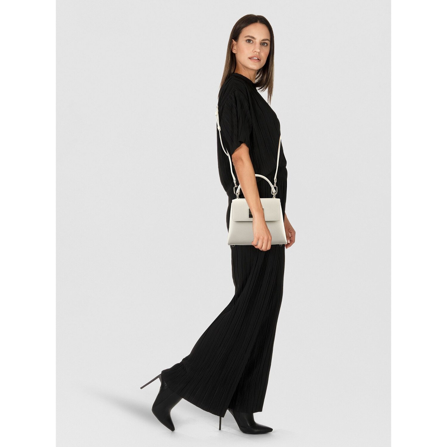 Bodennägel bieten einen zusätzlichen Schutz, wodurch die Tasche langlebig und robust wird. Der leicht zugängliche Verschluss und der verstellbare, abnehmbare Umhängeriemen versprechen maximalen Komfort und Flexibilität, während der kurze Hauptgurt eine modische Note verleiht.