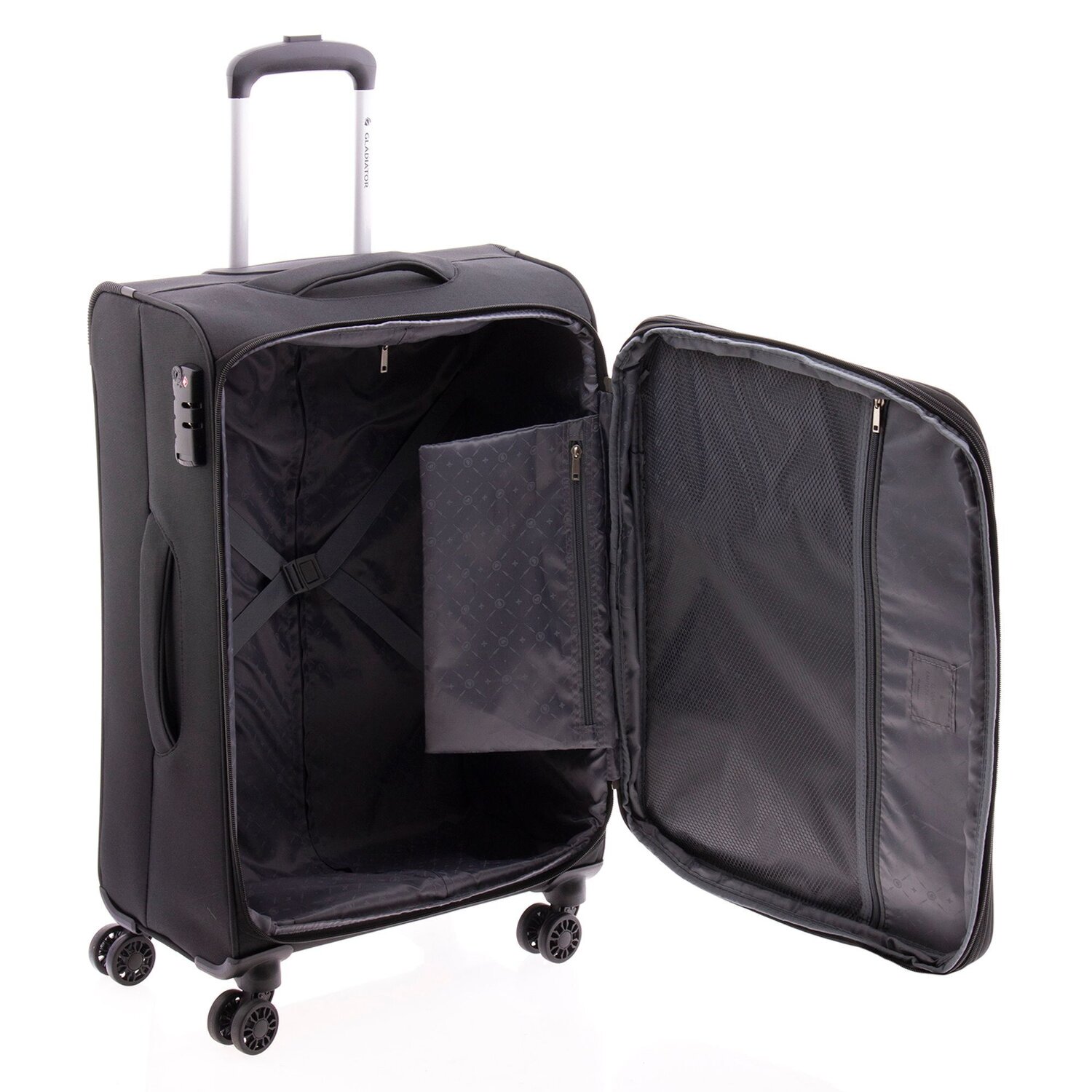 Erleben Sie den exklusiven Trolley von Gladiator aus strapazierfähigem Nylon – ein unverzichtbares Reiseaccessoire für Damen, Herren, Vielflieger und Globetrotter. Im Inneren bietet er einen Kreuzpackgurt sowie zwei geräumige Reißverschlussfächer für optimale Organisation Ihrer Kleidung und Reiseutensilien. Außen überzeugt er mit zwei Tragegriffen, einem arretierbaren Teleskopgriff und zwei praktischen Reißverschlussfächern. Die Besonderheiten umfassen ein integriertes TSA-Schloss für Sicherheit sowie eine Dehnfalte, die das Volumen von 66 l auf 74 l erweitert. Reisen Sie stilvoll und komfortabel mit dem Gladiator Nylon-Trolley.