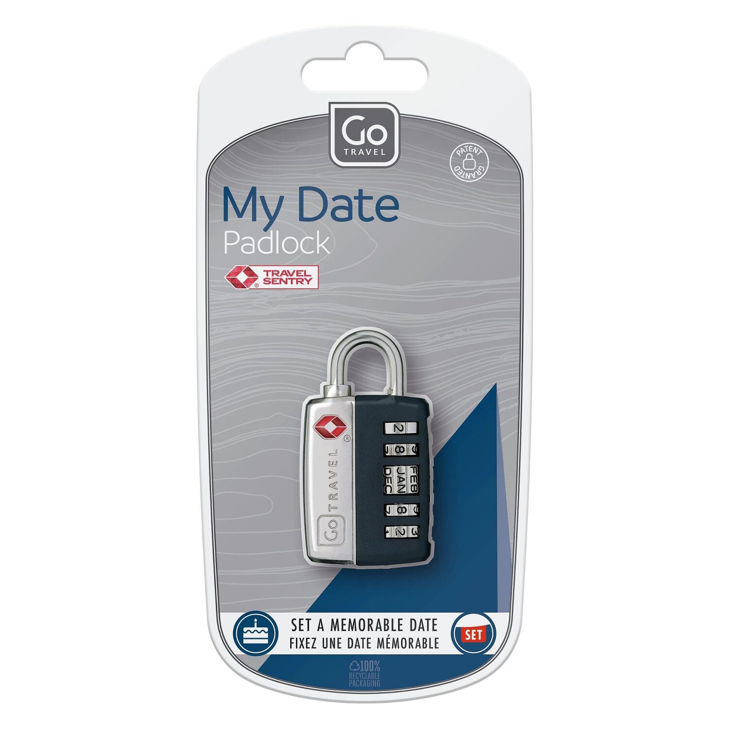 Praktisches Kofferschloss von Go Travel. Es nutzt fix das Datum als Code. Mit einer Kombination aus Zahlen und einem Monat, schützen Sie gekonnt Ihr Hab und gut auf Reisen, während es als TSA Schloss für behördliche Kontrollen zugänglich bleibt ohne Ihrem Gepäck zu schaden.
