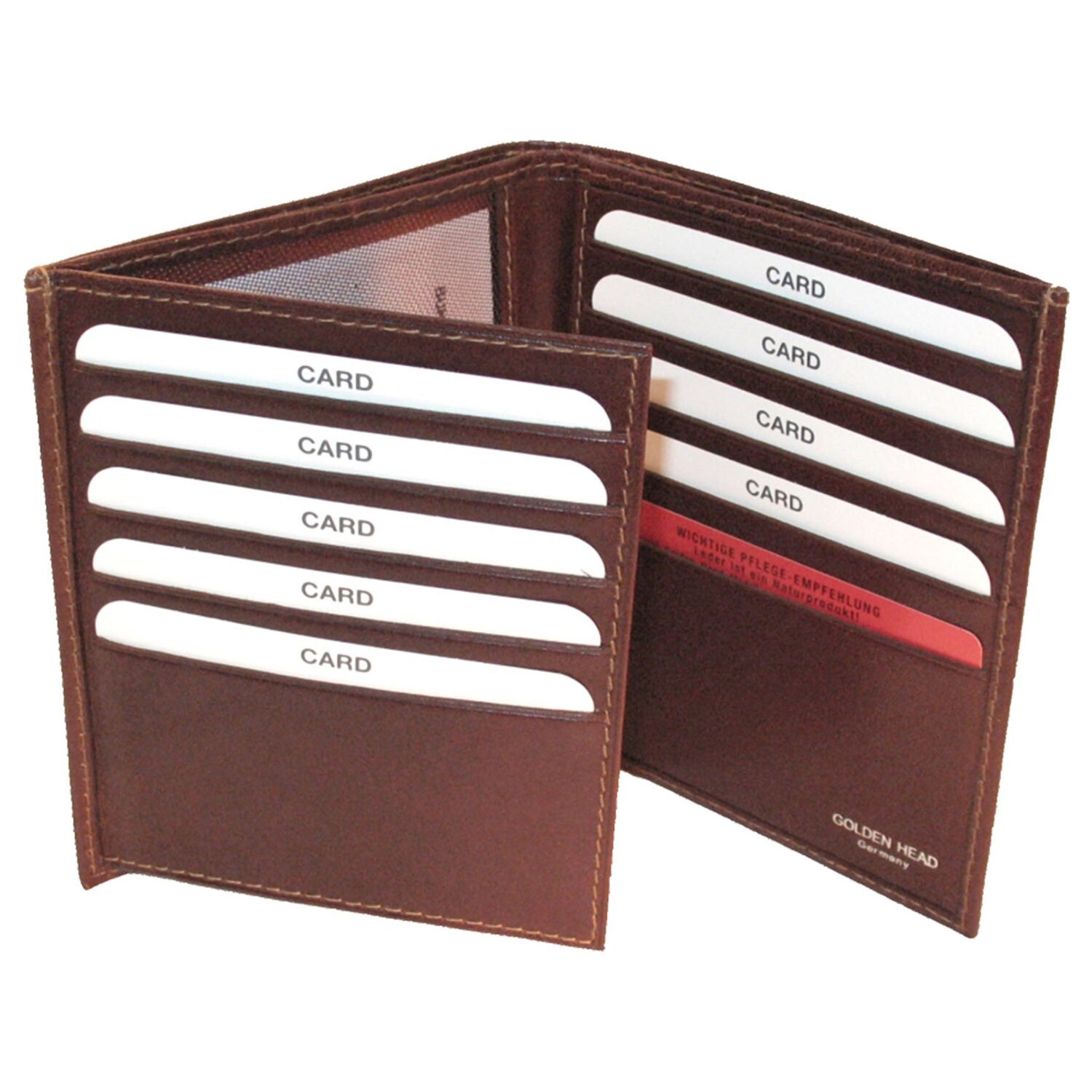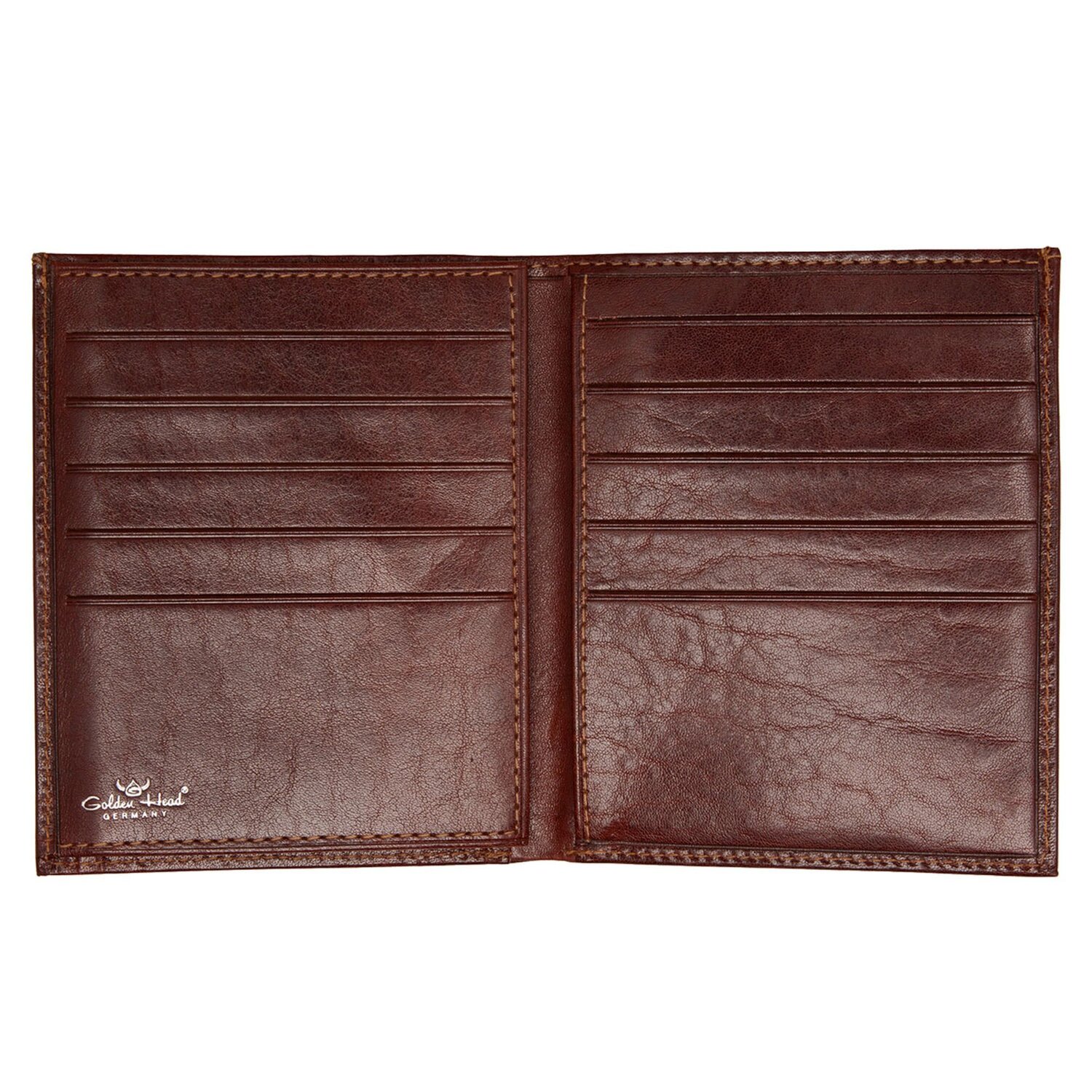 Golden Head Geldbörse aus handgefärbtem Vollrindleder. Mit Fächern für Karten und Scheine, sowie RFID-Blocker gegen Datendiebstahl. Die Börse hat ein Golden Head Metalllogo auf der Vorderseite, kommt ohne Münzfach und daher extrem flach.