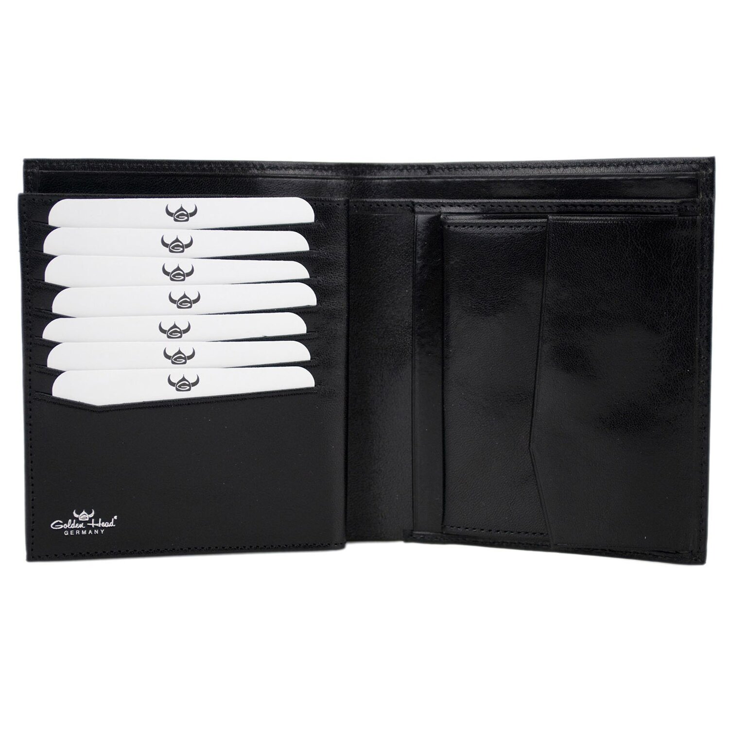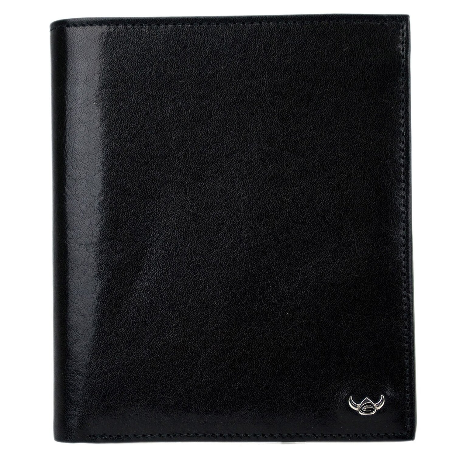 Golden Head Geldbörse aus feinem Leder. Mit Fächern für Karten, Scheine und Münzen sowie RFID-Blocker gegen Datendiebstahl. Die Börse hat ein Golden Head Metalllogo auf der Vorderseite.