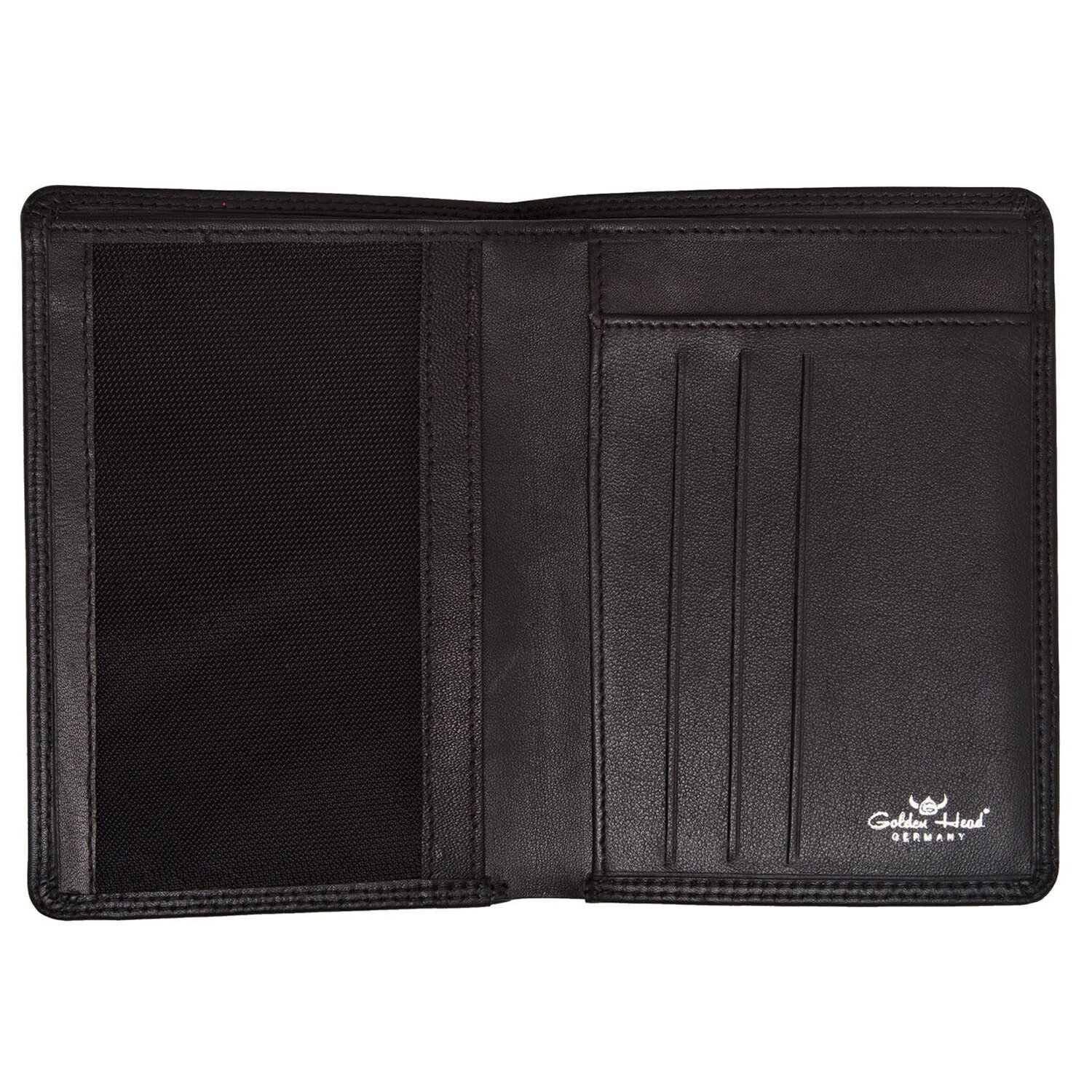 Schönes Ausweisetui von Golden Head aus hochwertigem Leder. Zudem können Sie dort Ihre Scheine, Karten und sonstiges unterbringen. Zusätzlich hat er RFID-Schutz gegen Datendiebstahl. Ein stilvolles Accessoire, das kompakt und praktisch ist.