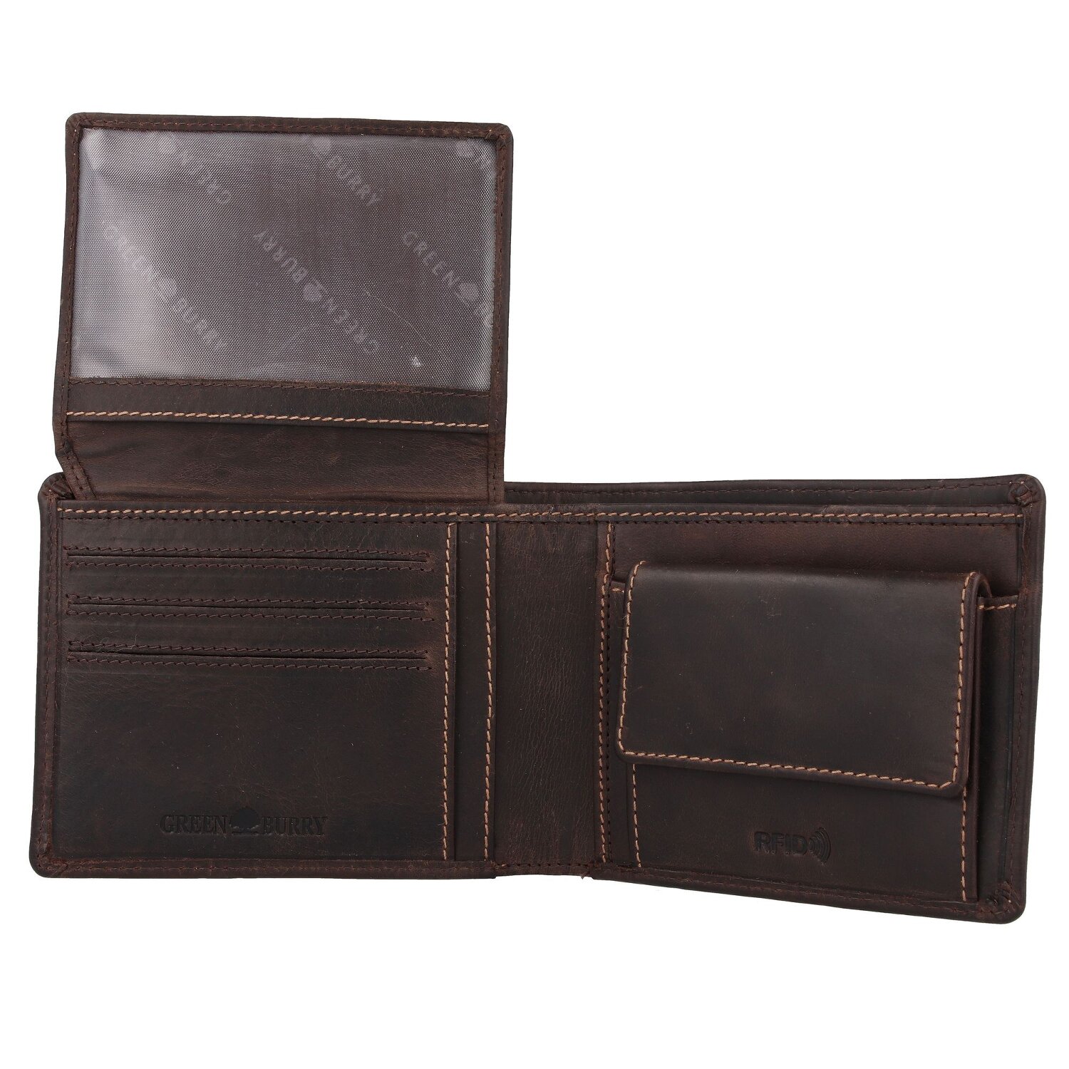 Hochwertige Geldbörse von Greenburry aus edlem Leder. Die Geldbörse ist mit mehreren Fächern perfekt ausgestattet und bietet genug Platz für, Bargeld, Kreditkarten und Ausweise.