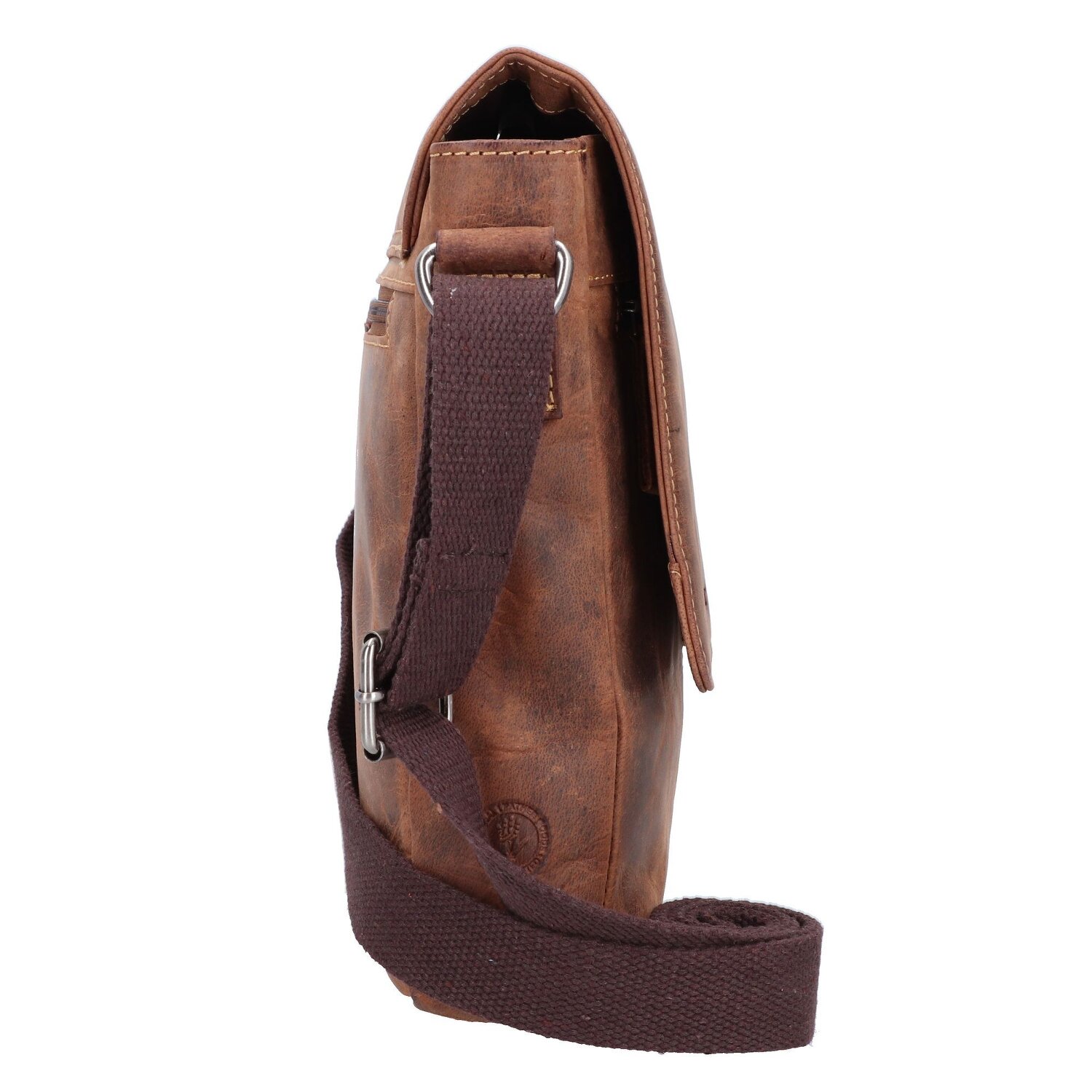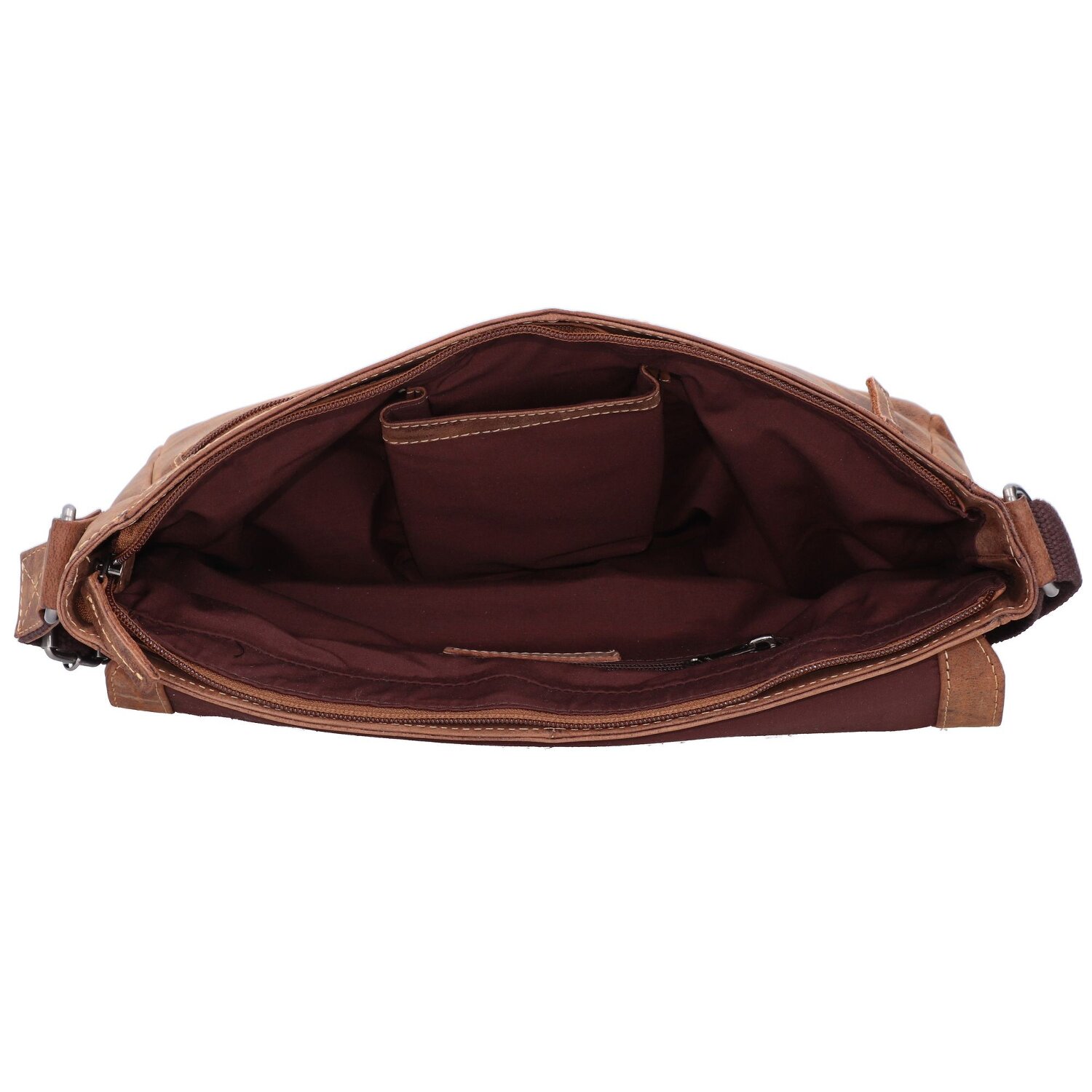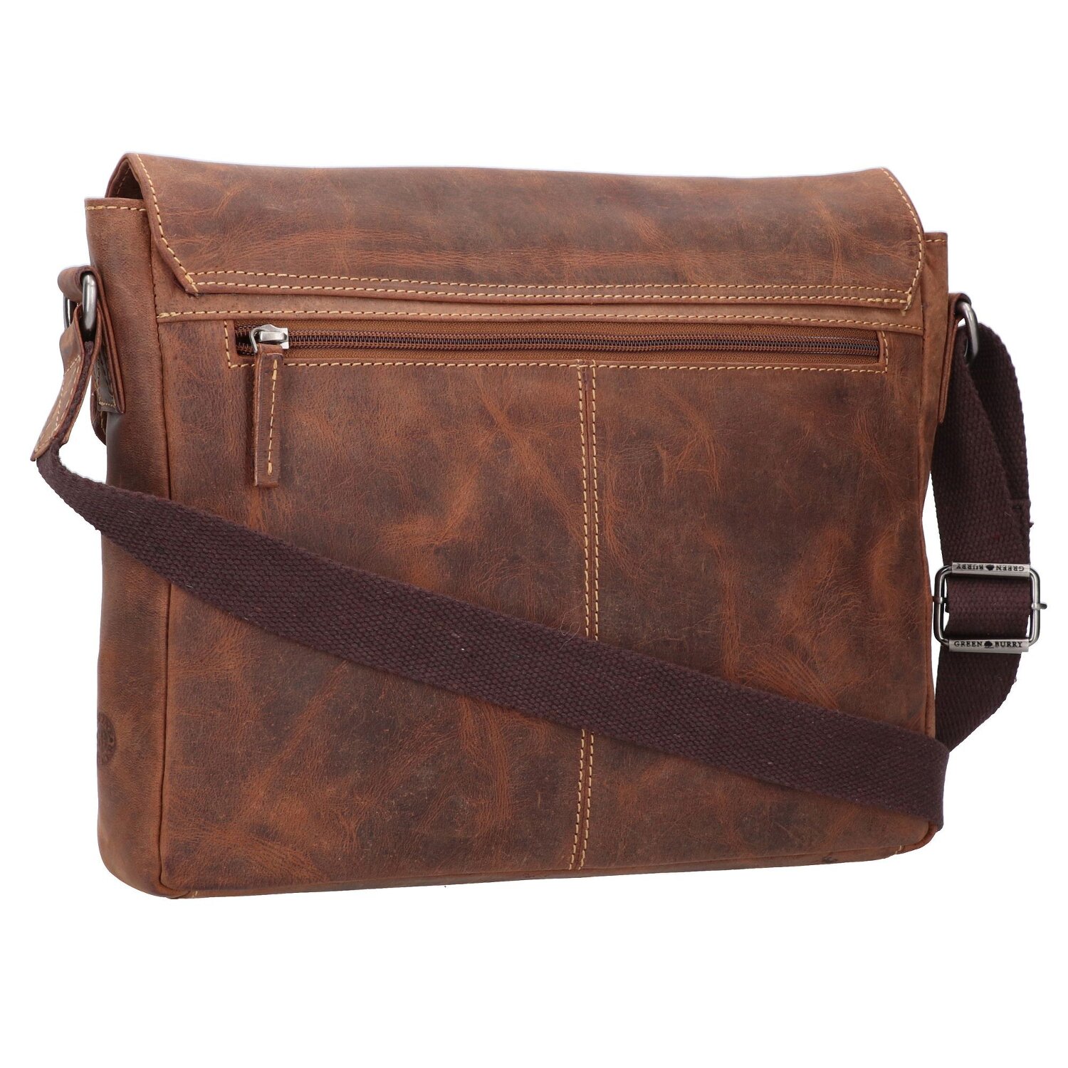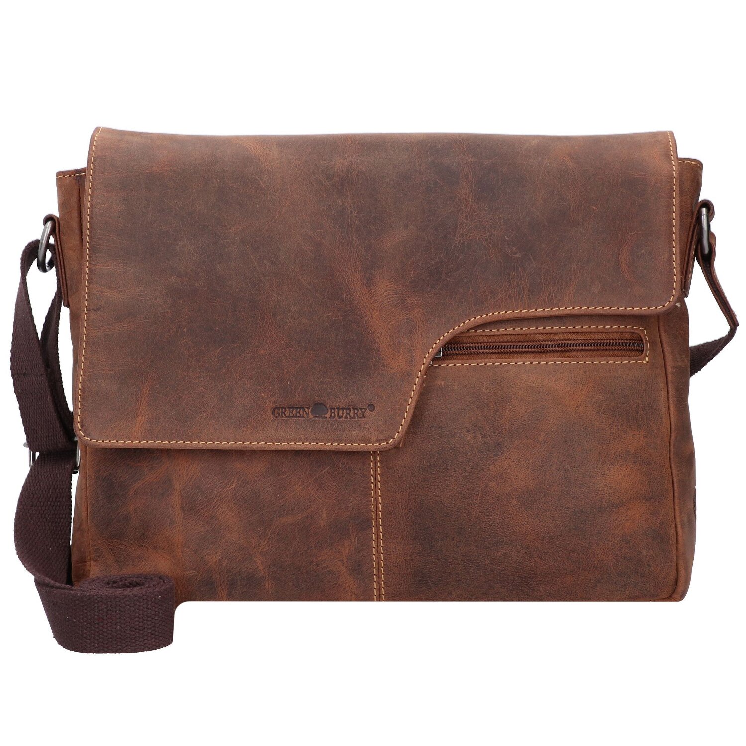 Umhängetasche von Greenburry in Vintage Optik aus Pull-Up-Leder. Auffallend ist die geschwungene Form des Überschlags, welcher sich mit Magnet verschließt. Im Hauptfach haben neben dem Handy unteranderem auch A4 Unterlagen und andere Utensilien im Reißverschlussfach Platz. Ebenso wie im Hauptfach gibt es auch auf der Außenseite Reißverschlussfächer. Ein toller Begleiter für das Büro oder auch die Stadt.