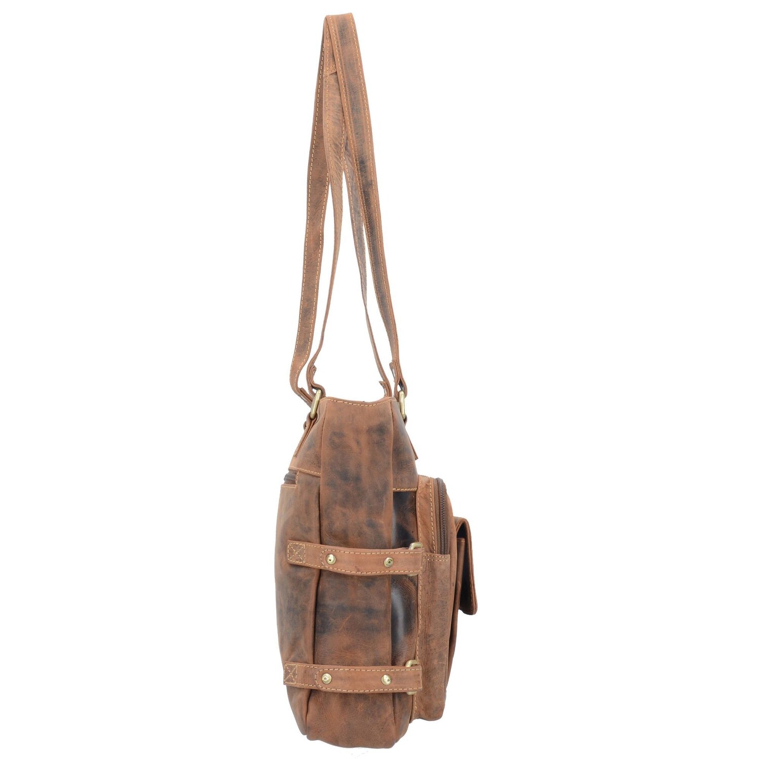 Außergewöhnliche Schultertasche aus naturbelassenem, gewaschenem und gewachstem Leder im Vintage-Look. Sie bietet viel Platz und mehrere Nebenfächer.