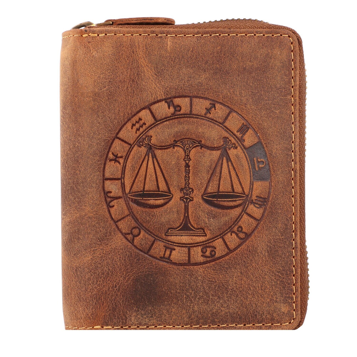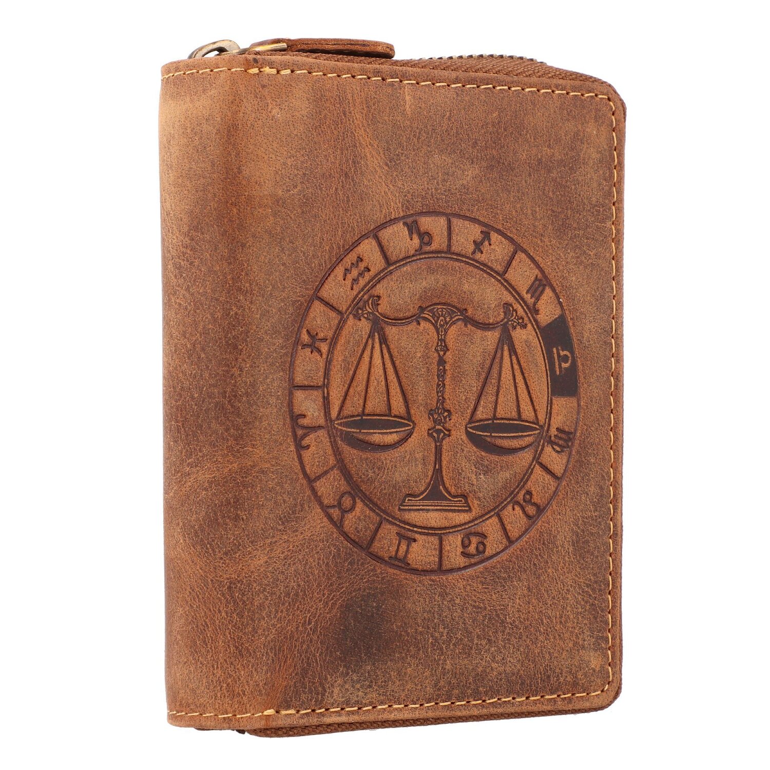 Wunderschöne Geldbörse von Greenburry aus Leder mit geprägtem Sternzeichen-Motiv auf der Frontseite. Der Geldbeutel bietet reichlich Platz für Kreditkarten, Scheine und Münzen.