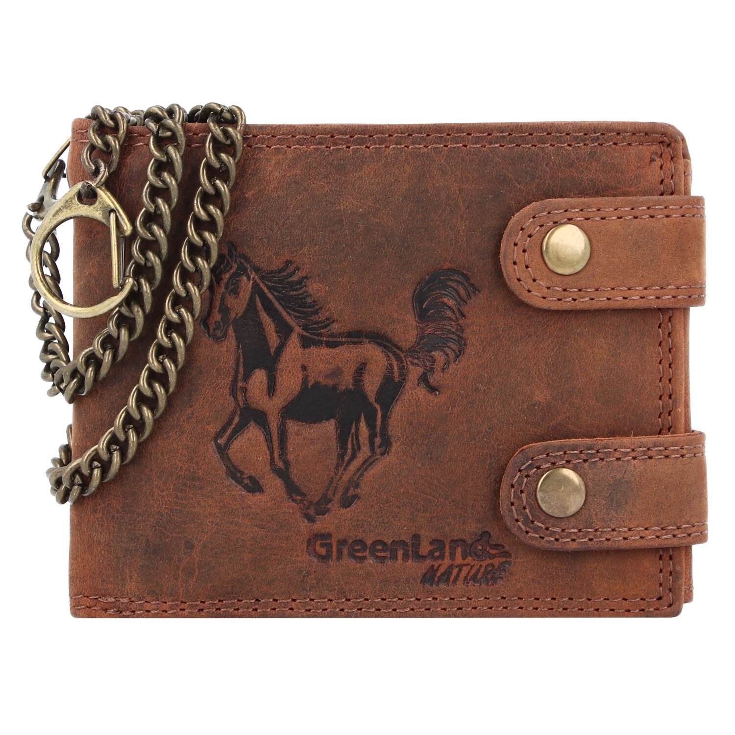 Hochwertige Herrengeldbörse von Greenland Nature aus echtem Leder. Der Geldbeutel ist mit einer Kette zur Befestigung am Hosenbund ausgestattet und bietet genügend Platz für Kreditkarten und Bargeld. Ihre Daten werden durch einen RFID Blocker geschützt.