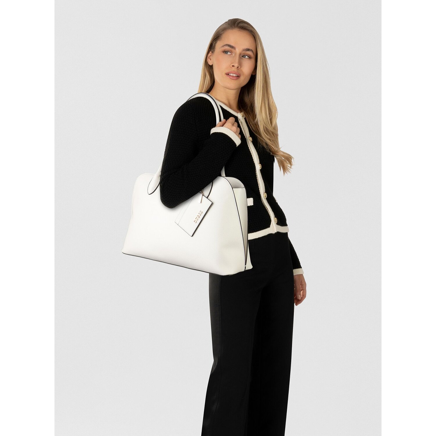 Tauchen Sie in die Welt der modebewussten Eleganz ein mit der Shoppertasche Patsie von Guess, die mehr als nur eine Tasche ist. Diese vielseitige Tasche aus widerstandsfähigem Polyurethan überzeugt mit ihrer Funktionalität und ihrer unverwechselbaren Optik. Praktische Taschen innen und außen, ein Raumteiler und ein Reißverschlussfach sorgen dafür, dass Ordnung und Übersicht stets gewahrt bleiben. Der Reißverschluss eignet sich hervorragend, um Ihre Sachen sicher und leicht zugänglich zu verstauen. Ein herausnehmbares Täschchen macht sie zum vielseitigen Begleiter. Dank des mittellangen, komfortablen Schulterriemens können Sie die Tasche ganz nach Belieben tragen. Nutzen Sie diese Tasche, um Ihren Look mit Stil zu vervollkommnen.