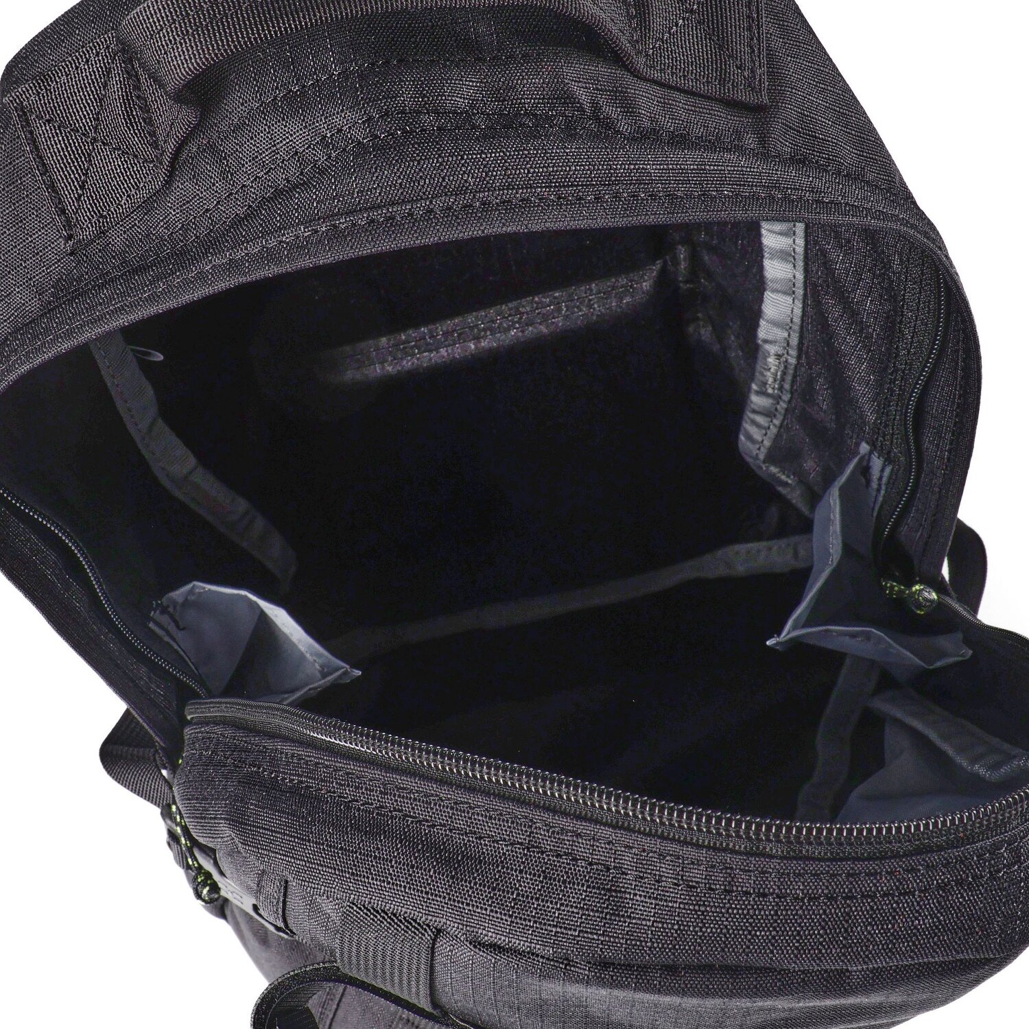 - Ausstattung: Rückenpolsterung, Reißverschlussfach, Kompressionsriemen, Brustgurt, Beckengurt