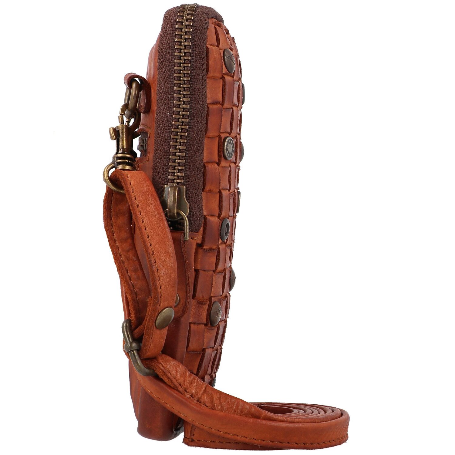 Schöne Handytasche von Harbour 2nd aus Leder mit gewebter Frontseite und Nieten. Auf der Rückseite befindet sich ein kleines Reißverschlussfach und der Umhängeriemen ist abnehmbar. Innen sind mehrere Kartenfächer.
