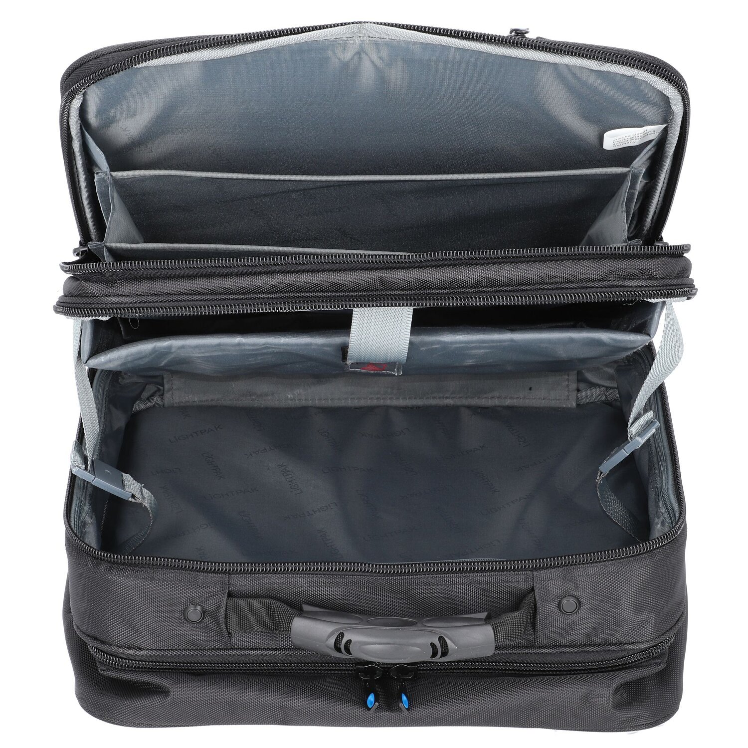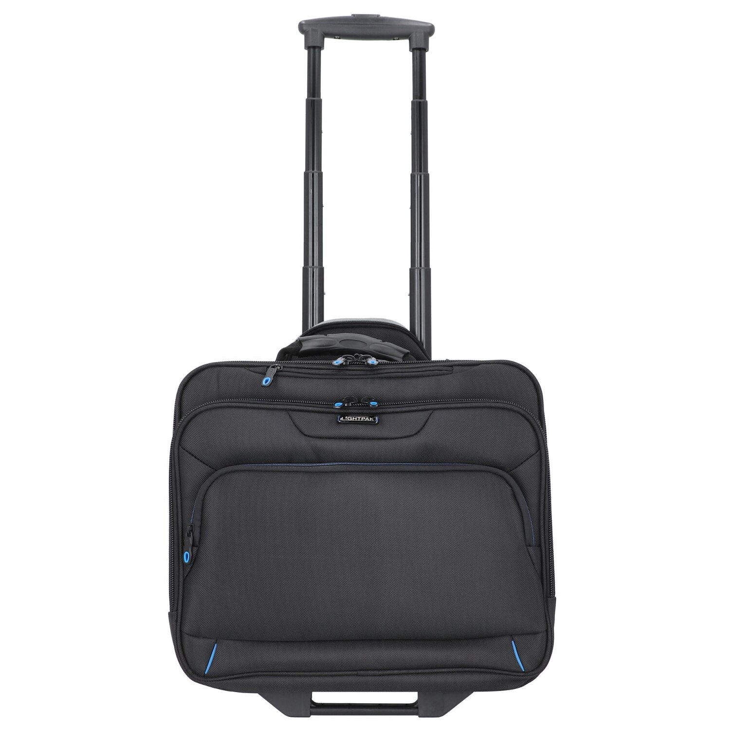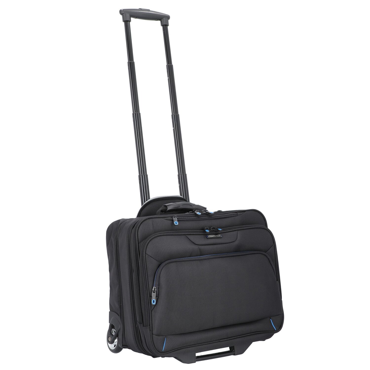 Funktionaler 2-Rollen-Businesstrolley von Lightpak aus strapazierfähigem Nylon in modernem, elegantem Design. Die geräumige Tasche verfügt über drei Hauptfächer, ein gepolstertes Laptopfach und ein Fächerfach mit drei Fächern für A4-Unterlagen. Vorne befindet sich zwei Reißverschlussfächer, eins davon mit Organizer, einem Handy- und einem Kreditkartenfach, zahlreichen Netz- und Einsteckfächern, sowie drei Stiftelaschen. Mit arretierbarem Griff und rückseitiger Trolley-Aufsteckfunktion ausgestattet.