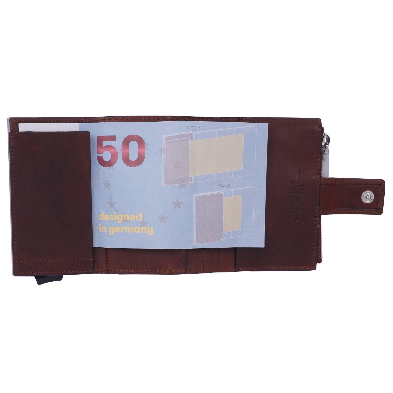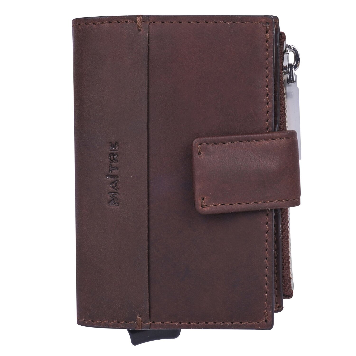 Kompaktes, elegantes Design, höchste Qualität und Sicherheit vereinen sich in diesem Kreditkartenetui aus Leder von Maître. In dem Kreditkartenfach finden bis zu 6 Karten Platz, die auf Knopfdruck in geordneter Reihenfolge herausgleiten. Zudem verfügt das Etui über drei weitere Steckfächer. Das Etui wird per Druckknopf sicher geschlossen.