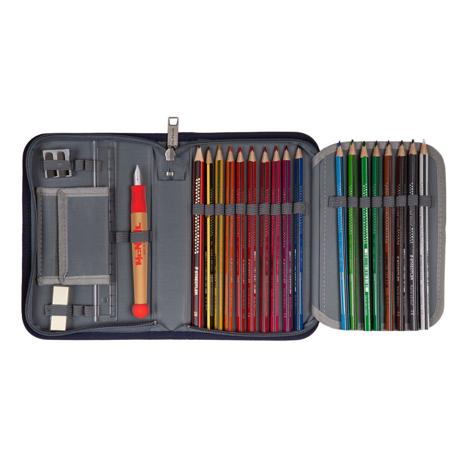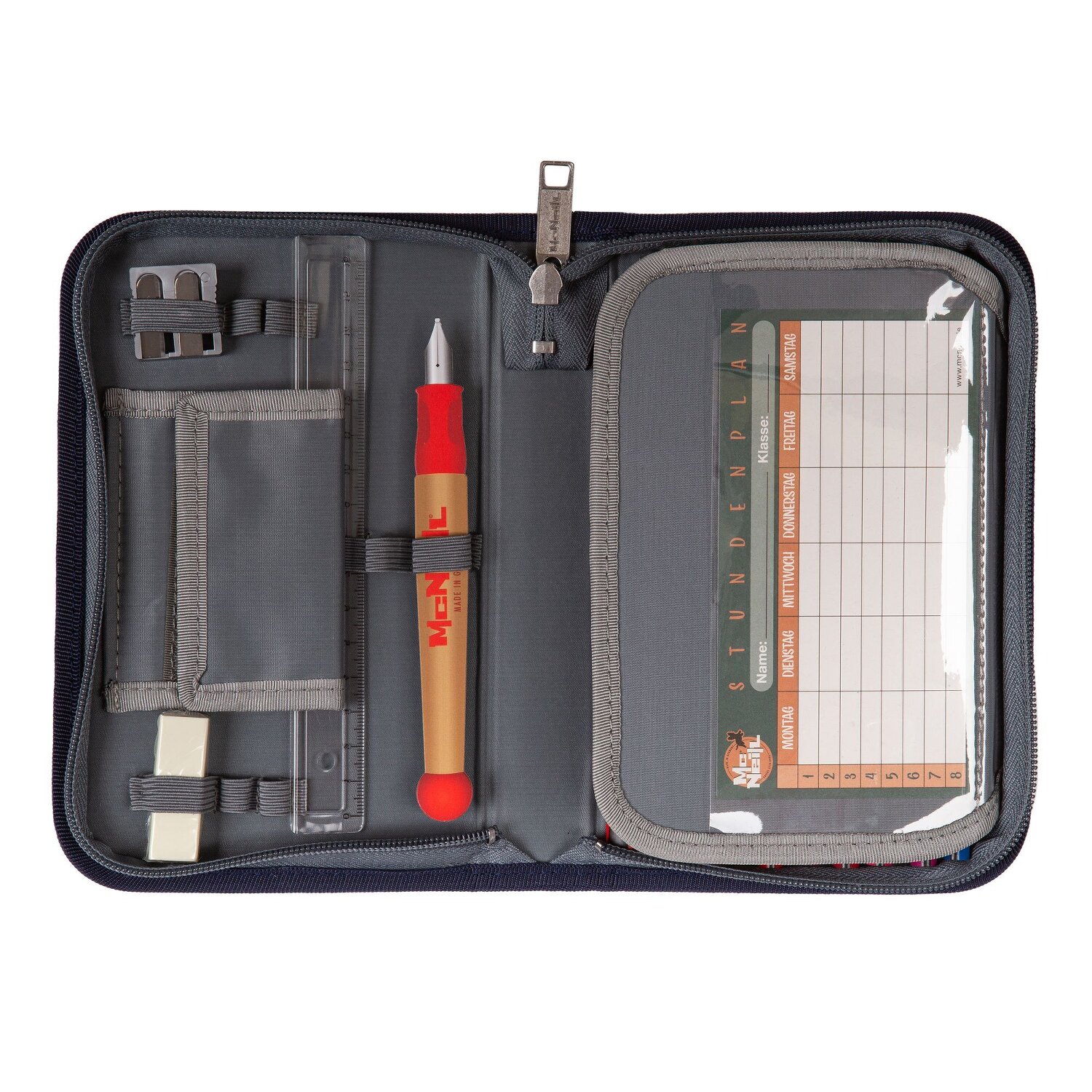 McNeill Mäppchen 23tlg., gefüllt mit vielen hochwertigen Stiften, einem Radiergummi, Anspitzer, Stundenplan, Lineal usw. Das Mäppchen schließt sich mit Reißverschluss.