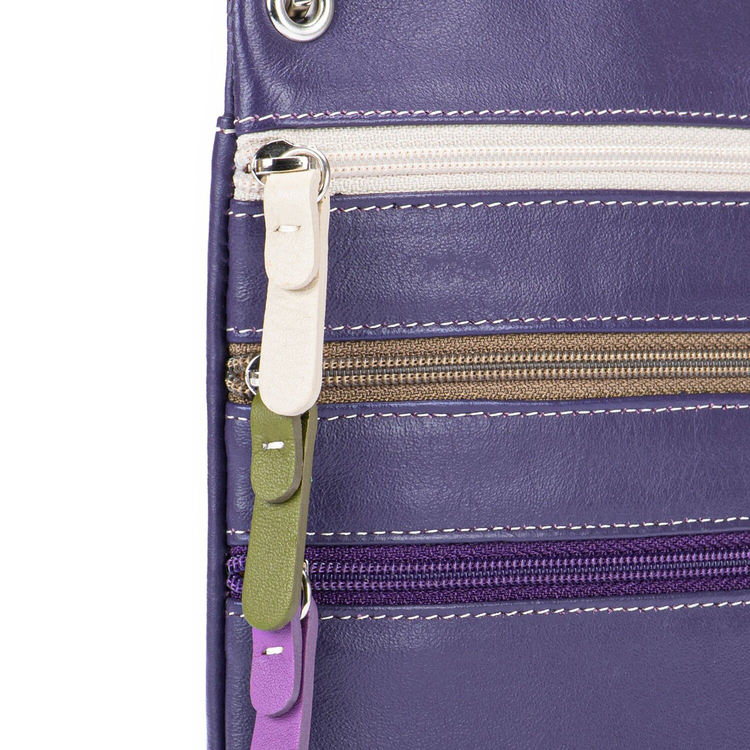 Schicker Lederbrustbeutel im bunten, einzigartigen Design. Viele verschiedene Farbvarianten machen diese Umhängebörse zum Hingucker. Der Brustbeutel hat drei Reißverschlussfächer außen und ein offenes Außenfach hinten. Der ideale modische Begleiter auf Reisen.