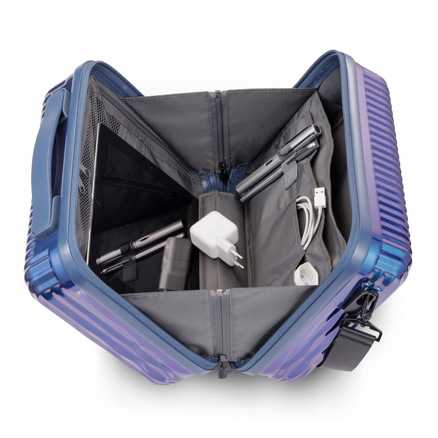 - Ausstattung: Tasche(n) innen, Reißverschlussfach, Netzfach, auf Trolley steckbar