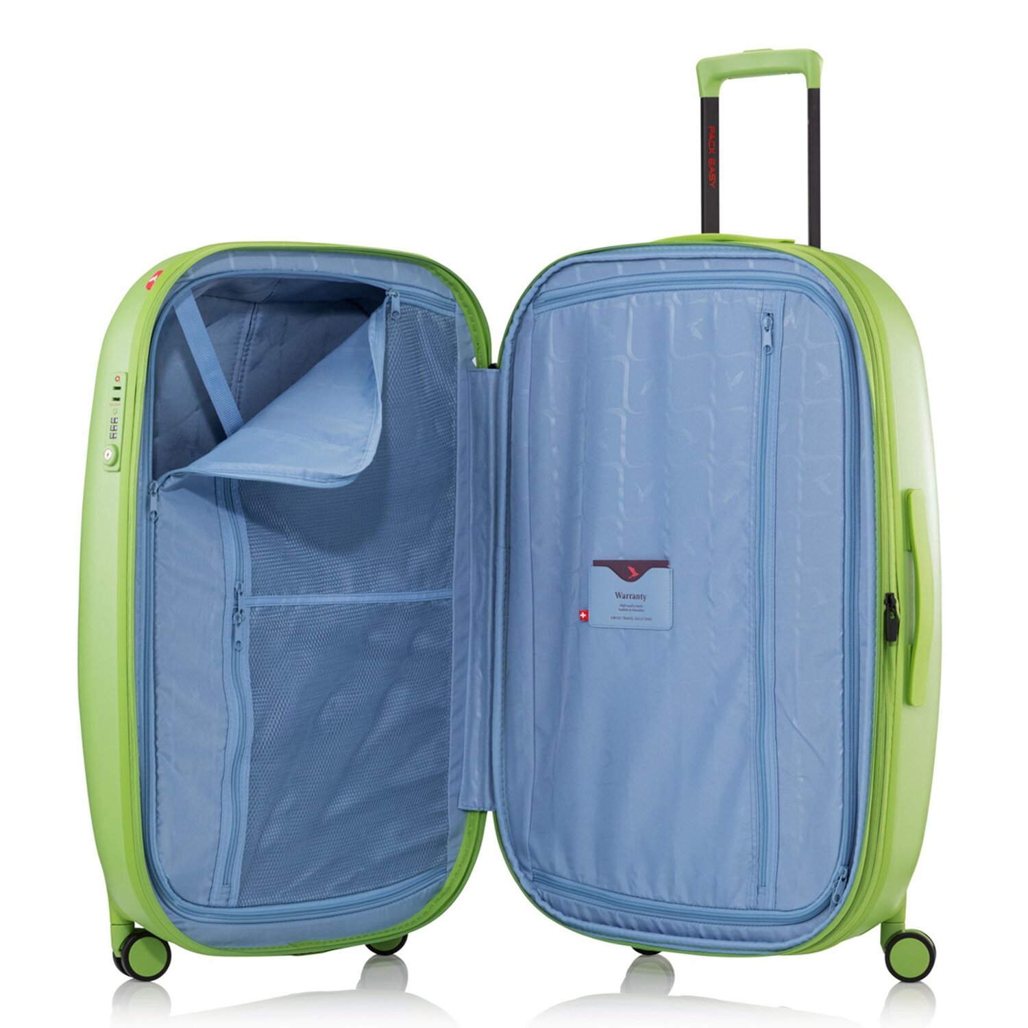 Robuster 4-Rollen Trolley von Pack Easy. Er ist leicht, wasserdicht und ein echter Hingucker. Er hat einen Teleskopgriff, vier stabile Doppelrollen und ein großes Innenfach mit Reißverschluss sowie Packriemen. Der zuverlässige Begleiter für alle, die viel reisen.