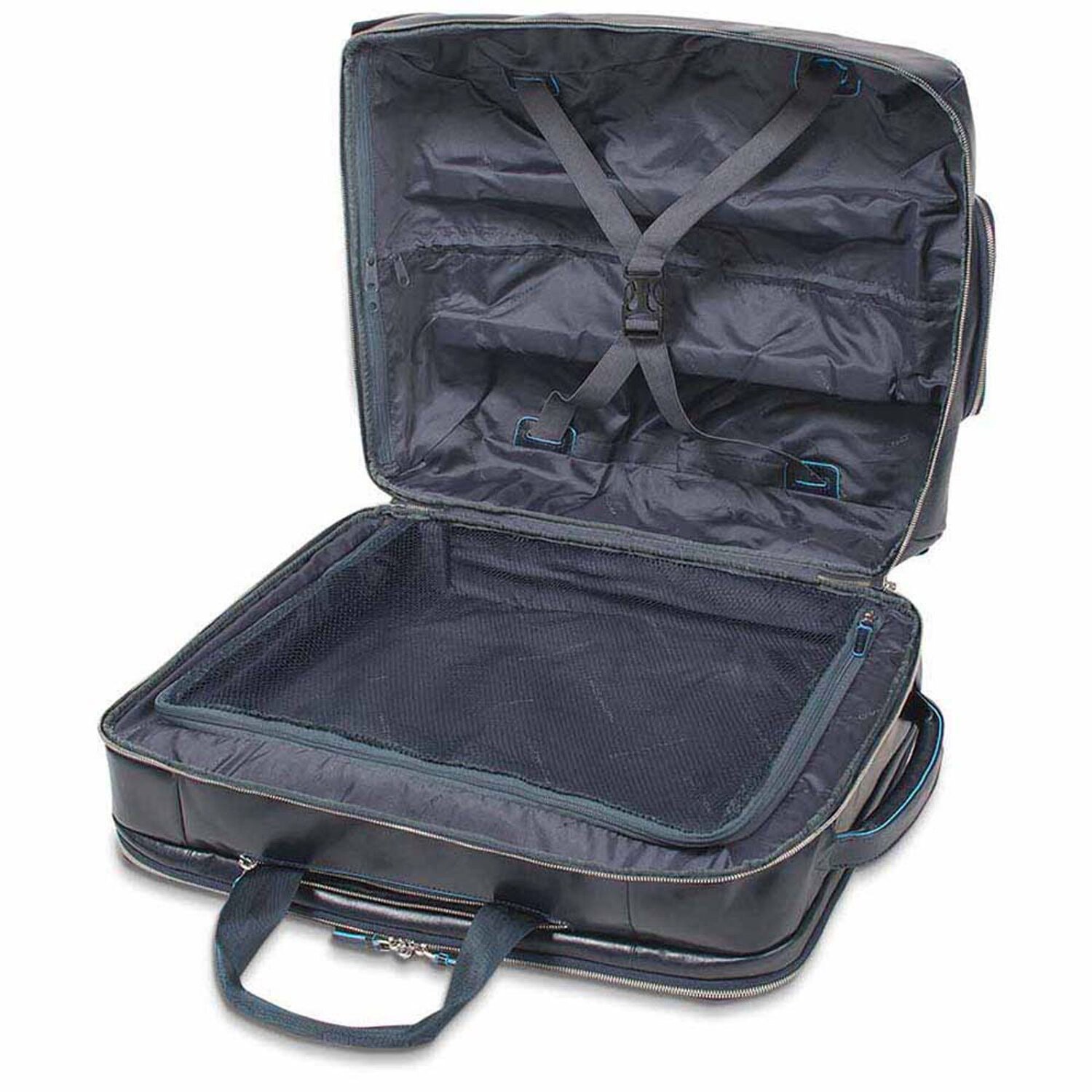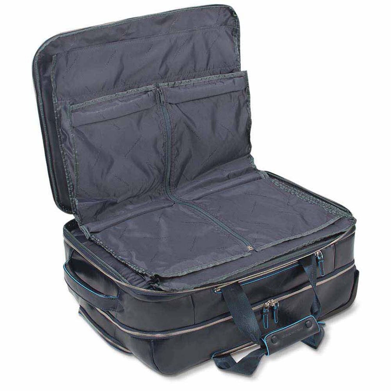 Piquadro Blue Square Businesstrolley aus Kalbsleder mit Mineralgerbung aus Chrom und Feinbearbeitung mit Anilin. Die hellblau gefärbten Ränder beleben den Business-Charakter der Kollektion.