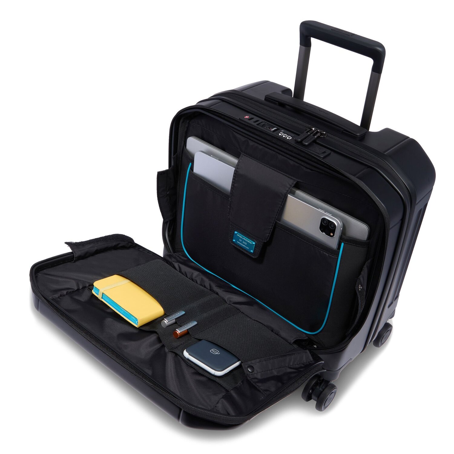 - Ausstattung: Trenn-/Packplatte, Tasche(n) innen, Platz für kleinen Aktenordner, Platz für großen Aktenordner, Handyfach, arretierbarer Griff, Anschluss für USB-Powerbank