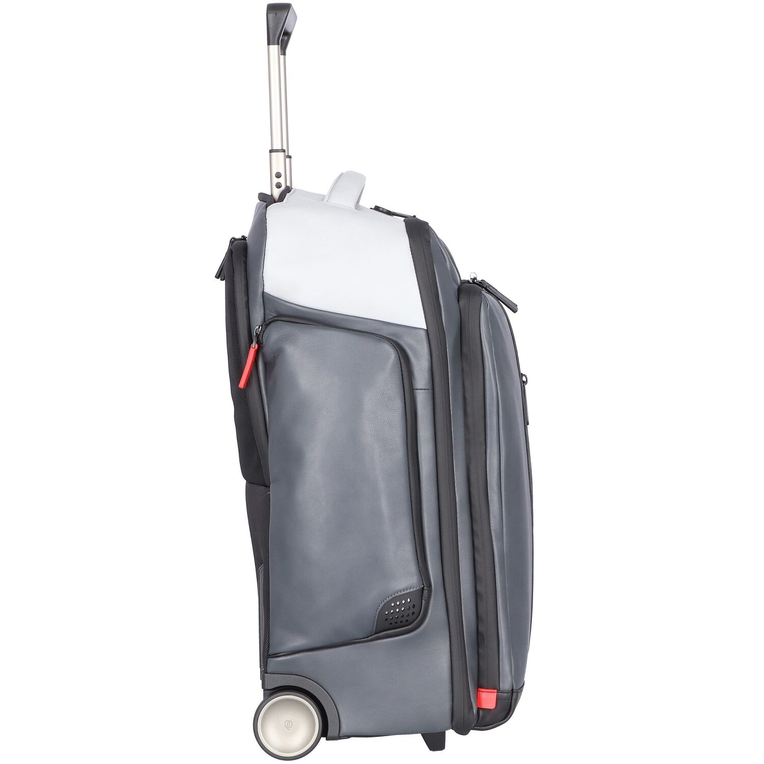2-Rollen Businesstrolley von Piquadro der Urban Serie aus hochwertigem Leder mit Rucksackfunktion und arretierbarem Griff. Das Hauptfach mit Kreuzpackgurt bietet genug Platz für eine Geschäftsreise und kann bei den meisten Fluggesellschaften als Handgepäck genutzt werden. Das Reißverschlussfach auf der Front ist mit einem gepolstertem Laptop- und Tabletfach ausgestattet. Im Hauptfach kann eine Powerbank angeschlossen werden, welche mit Kabeln mit dem Seitenfach verbunden ist, sodass Sie bequem ihre Geräte laden können.
