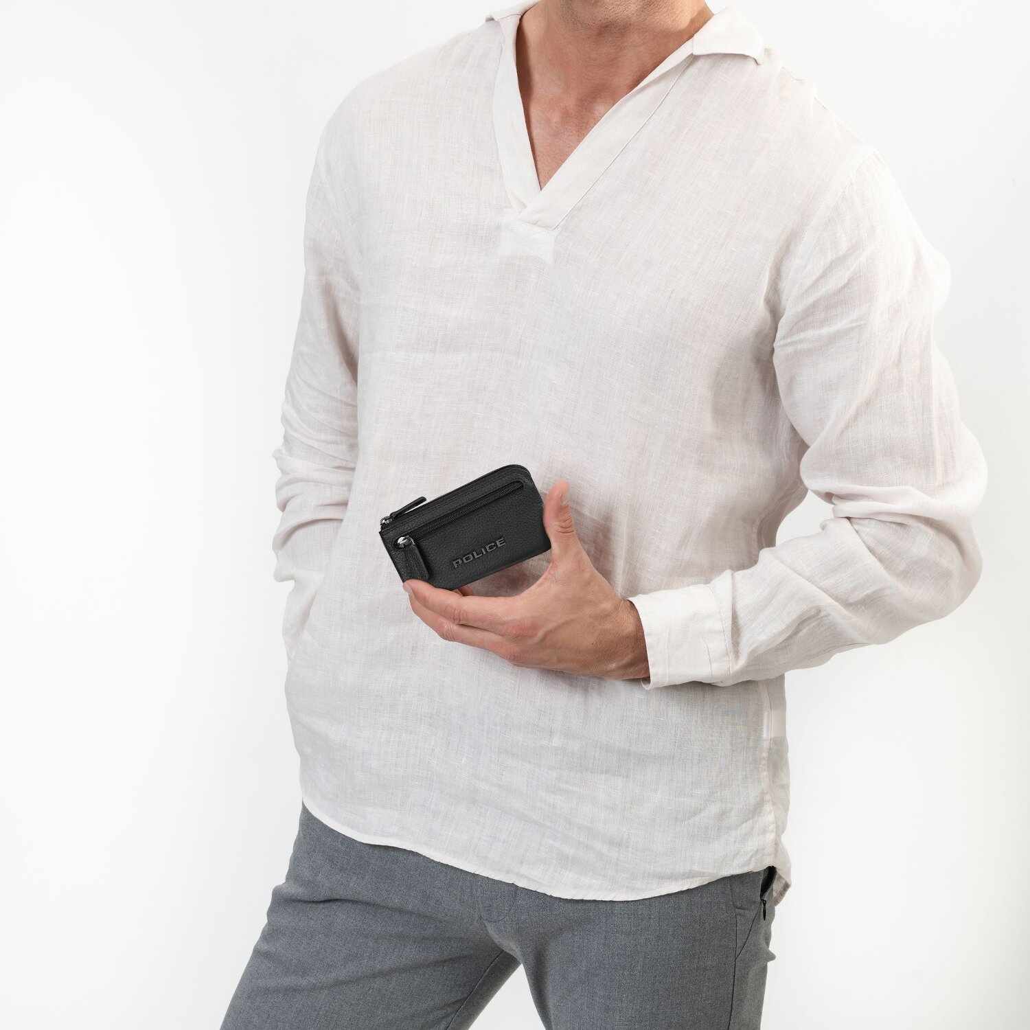 Praktisches Schlüsseletui von Police aus hochwertigem Leder. Neben dem Schlüsselring bietet es außen noch ein Reißverschlussfach.