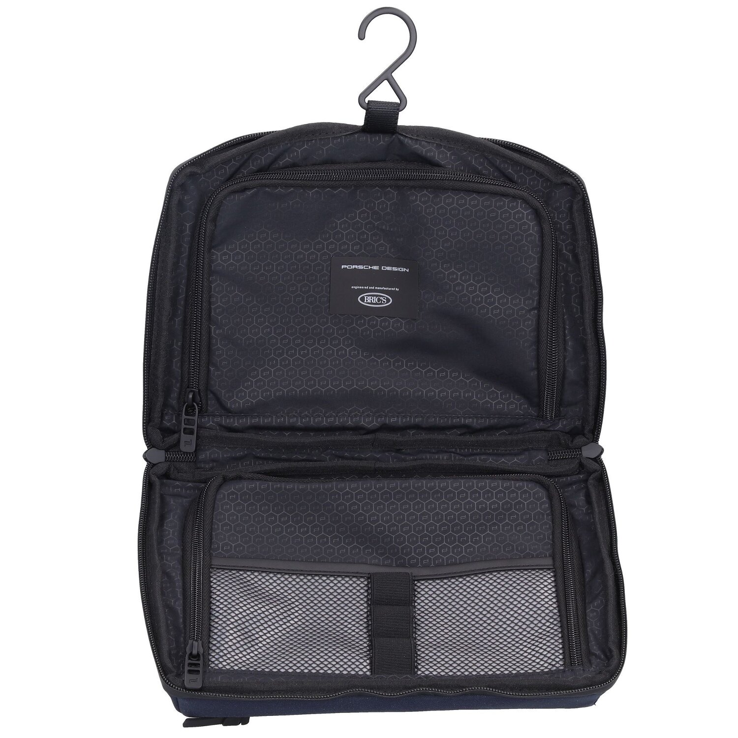 Luxuriöser Kulturbeutel der Marke Porsche Design. Die Tasche besticht durch ihre hohe Verarbeitungsqualität und ihr geradliniges Design. Sie besitzt ein Hauptfach mit Netzfach und Reißverschlussfach sowie Laschen für Zahnbürsten im Inneren. Das Außenfach sorgt für zusätzlichen Stauraum. Mit dem integrierten Haken kann der Kulturbeutel auch aufgehangen werden. Der schicke Begleiter auf Geschäftsreisen.
