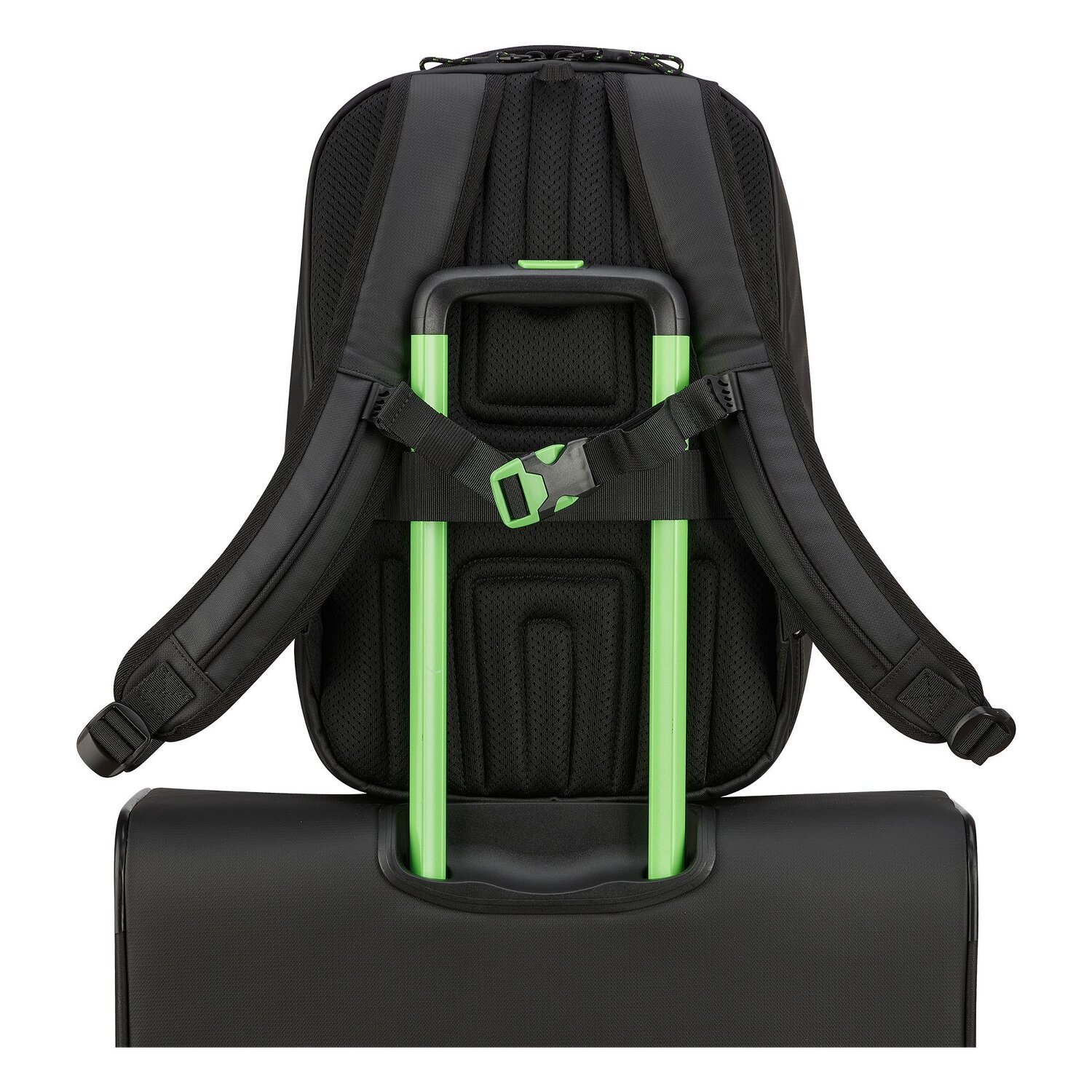 - Ausstattung: Trinkflaschenfach, Tasche(n) innen, Tasche(n) außen, Rückenpolsterung, Reißverschlussfach, Netzfach, Brustgurt, auf Trolley steckbar