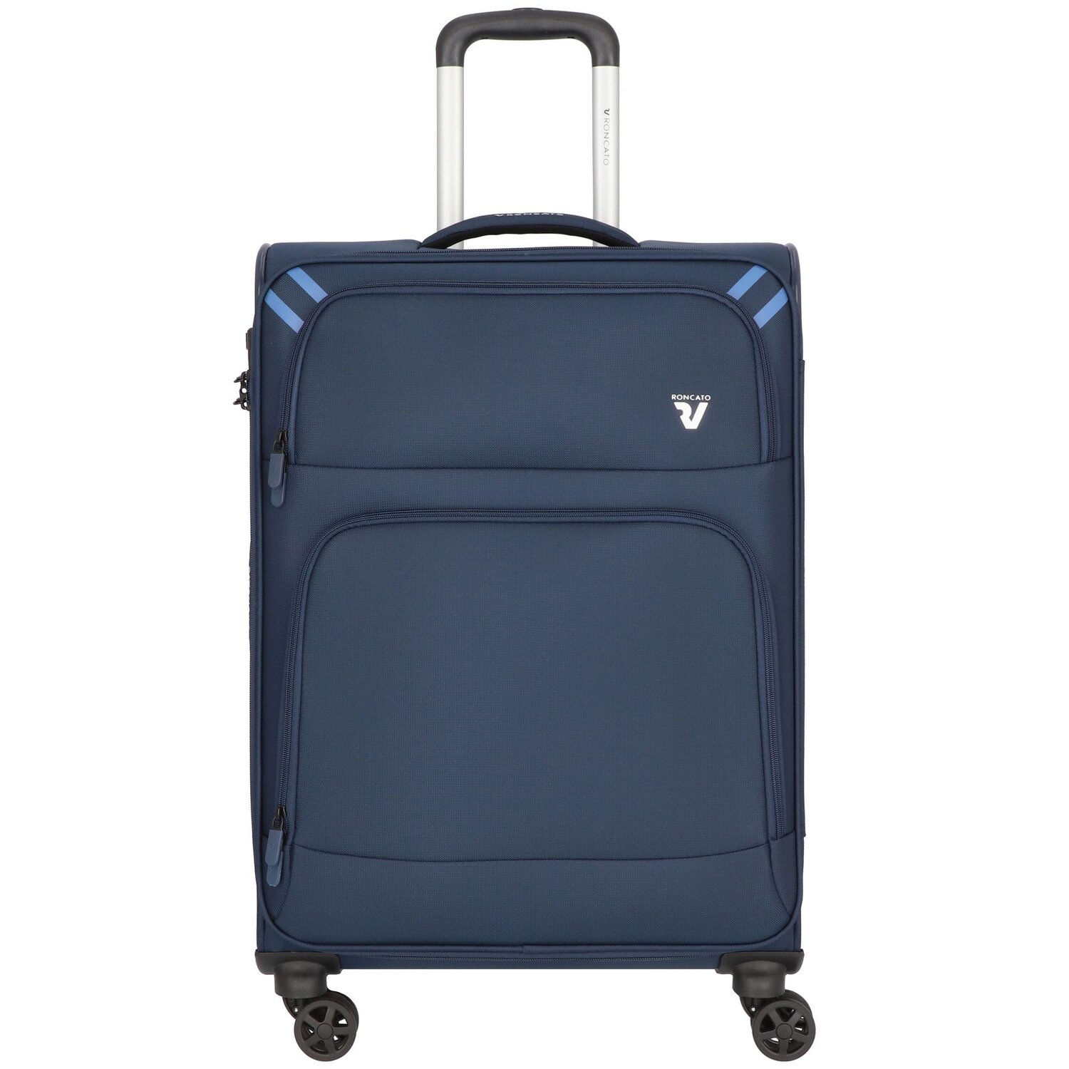 Gut organisierter Trolley der Twin Serie von Roncato aus reißfestem Material. Er verfügt über ein geräumiges Hauptfach mit Packriemen und einem Mesh-Reißverschlussfach sowie weitere Reißverschlussfächer auf der Frontseite. Mit vier leicht zu manövrierenden und geräuscharmen Doppelrädern, einem integriertem TSA-Schloss für mehr Sicherheit ausgestattet.