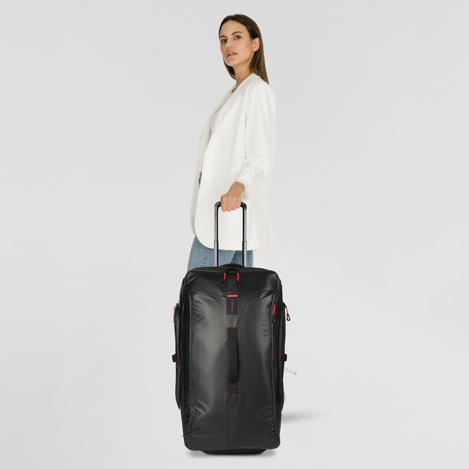 - Ausstattung: Tasche(n) innen, Tasche(n) außen, Reißverschlussfach, Kreuzpackgurt, arretierbarer Griff