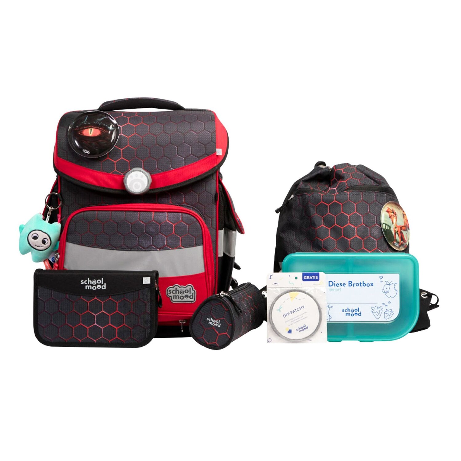 die Sicherheit der kleinen Abenteurer sorgen. Erleben Sie Komfort und Funktionalität in einer cleveren Tasche - der idealen Wahl für jede Schule. Maße: 36 cm x 21 cm x 42 cm - 0,99 kg - 23,5 L im Set enthalten sind ein Turnbeutel, ein Etui (21-tlg.), eine Schlamperrolle, eine Brotdose, ein Patchy-Set (3-tlg.) und ein