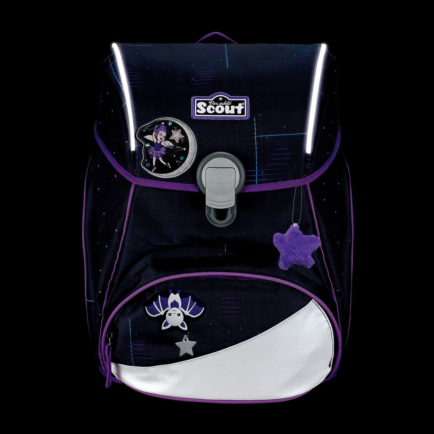 5-teiliges Schulranzen-Set von Scout, bestehend aus Schulranzen, Sportbeutel, Schlamper-Etui, Federmäppchen und Funny Snaps Move Magneten. Zusätzlich beinhaltet dieser Schulranzen Safety Light mit LED-Lichtleitern und Powerbank mit Taschenlampen-Funktion.