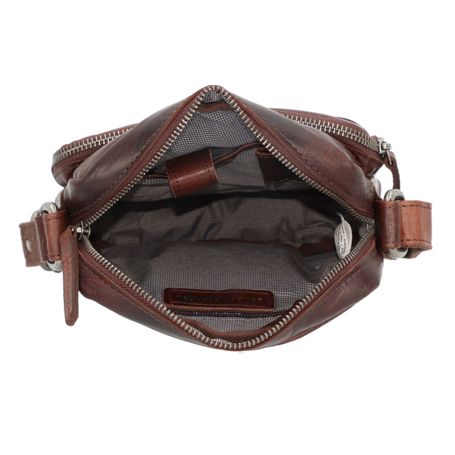 Edle Umhängetasche von Spikes & Sparrow aus hochwertigem Leder mit längenverstellbarem Umhängeriemen. Die Tasche verfügt über ein übersichtliches Hauptfach, ein Handy- und Reißverschlussfach sowie weitere Fächer und zwei Stiftelaschen.