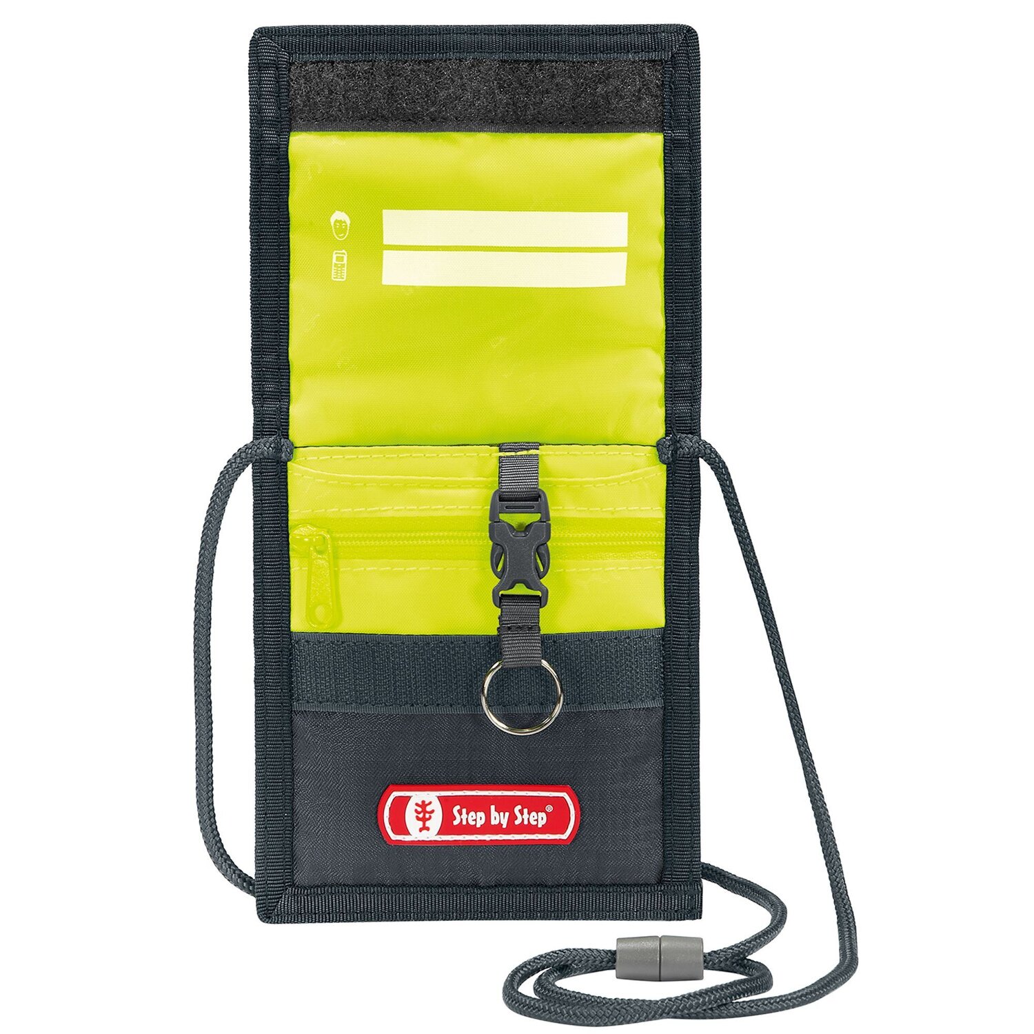 In dem Brustbeutel von Step by Step kann Ihr Kind alles verstauen, was es braucht: Fahrkarte, Geld, Schülerausweis, Schlüssel, etc. Innen gibt es ein Adressfeld und einen abnehmbaren Schlüsselring. Auf der Rückseite befindet sich ein Klarsichtfach und das Umhängeband hat einen Sicherheitsverschluss.