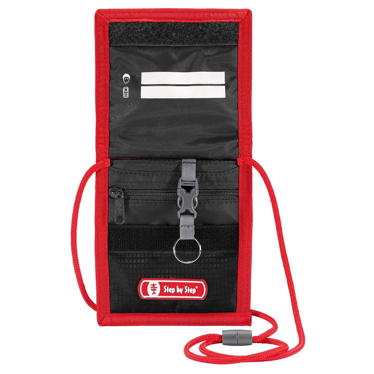 In dem Brustbeutel von Step by Step kann Ihr Kind alles verstauen, was es braucht: Fahrkarte, Geld, Schülerausweis, Schlüssel, etc. Innen gibt es ein Adressfeld und einen abnehmbaren Schlüsselring. Auf der Rückseite befindet sich ein Klarsichtfach und das Umhängeband hat einen Sicherheitsverschluss.