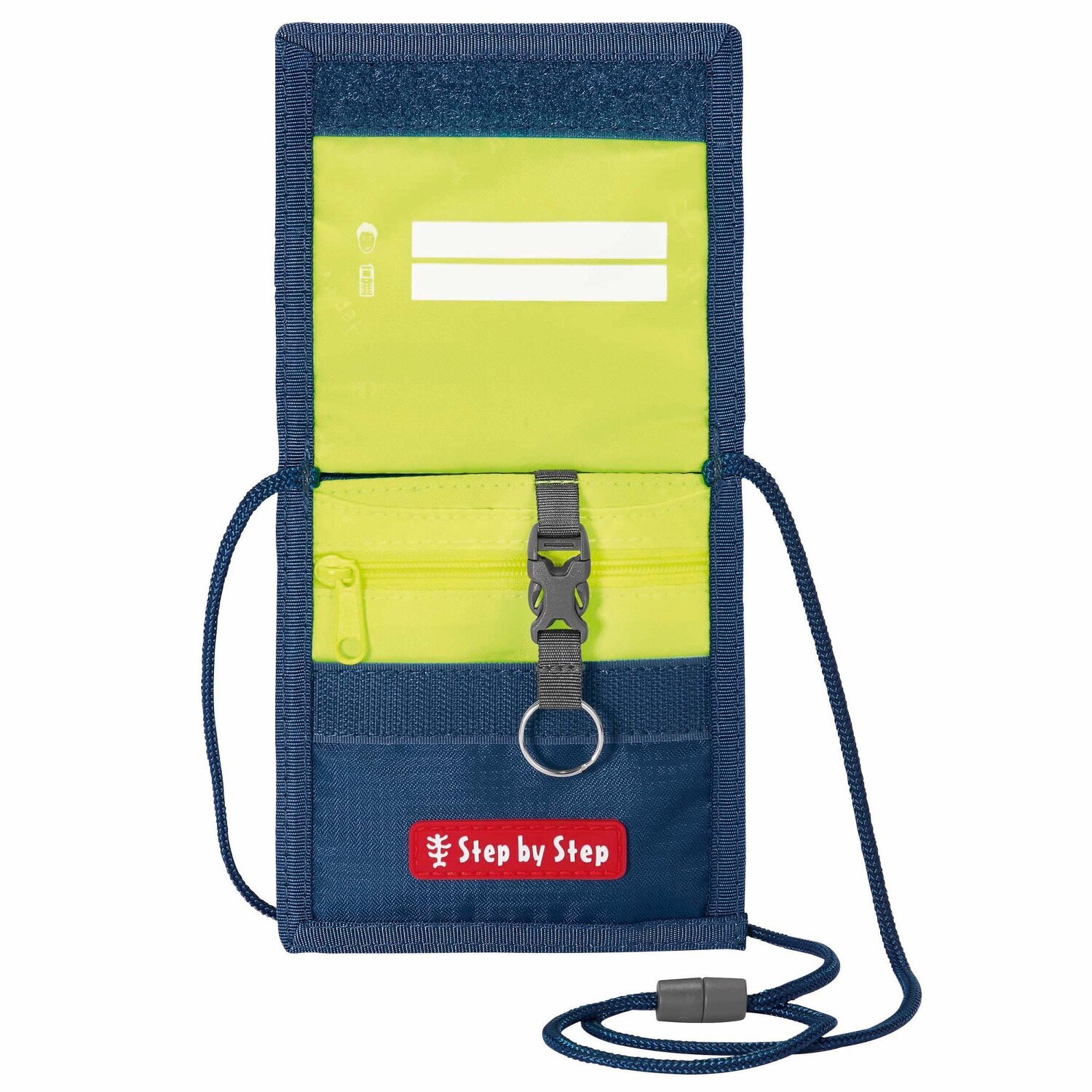 In dem Brustbeutel von Step by Step kann Ihr Kind alles verstauen, was es braucht: Fahrkarte, Geld, Schülerausweis, Schlüssel, etc. Innen gibt es ein Adressfeld und einen abnehmbaren Schlüsselring. Auf der Rückseite befindet sich ein Klarsichtfach und das Umhängeband hat einen Sicherheitsverschluss.
